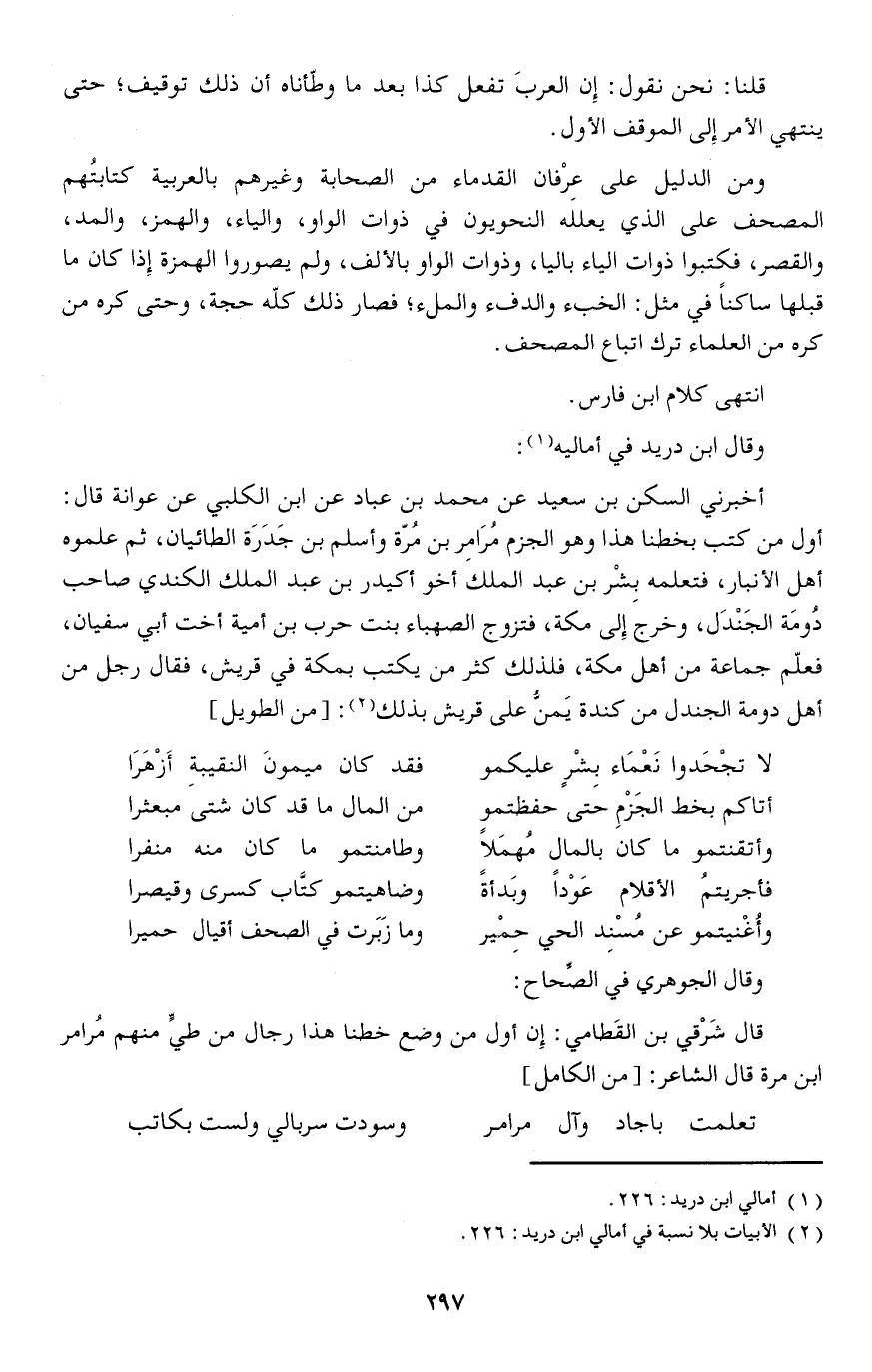 ومن الدليل على عِرْفان القدماء من الصحابة وغيرهم بالعربية كتابتُهم المصحف على الذي يعلله النحويون في ذوات الواو، والياء، والهمز، والمد، والقصر، فكتبوا ذوات الياء باليا، وذوات الواو بالألف، ولم يصوروا الهمزة إذا كان ما قبلها ساكنا في مثل: الخبء والدفء والملء فصار ذلك كله حجة، وحتى كره من كره العلماء ترك أتباع المصحف.