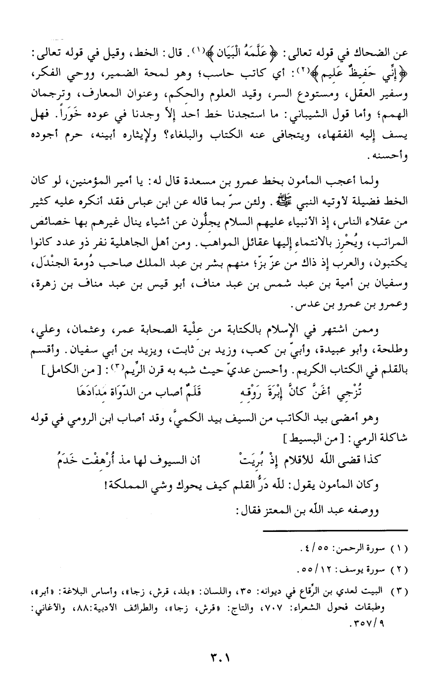 قال: الخط، وقيل في قوله تعالى: {إنِّي حَفِيظٌ عَلِيم} : أي كاتب حاسب وهو لمحة الضمير، ووحي الفكر، وسفير العقل، ومستودع السر، وقيد العلوم والحِكم، وعنوان المعارف، وترجمان الهمم وأما قول الشيباني: ما استجدنا خط أحد إلا وجدنا في عوده خَوَراً.
