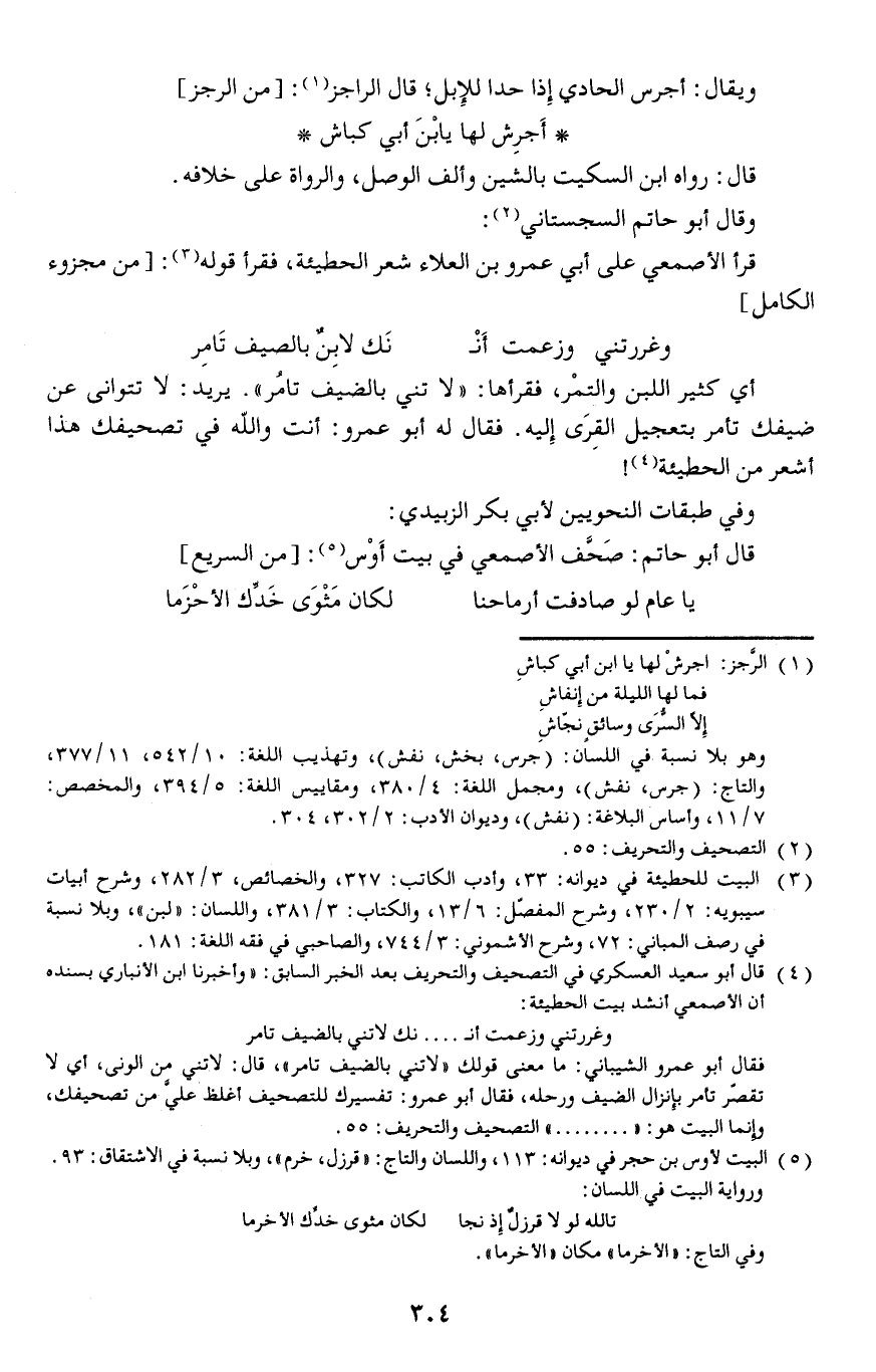 فقال له أبو عمرو: أنت والله في تصحيفك هذا أشعر من الحطيئة وفي طبقات النحويين لأبي بكر الزبيدي: قال أبو حاتم: صحف الأصمعي في بيت أوس: // من السريع //