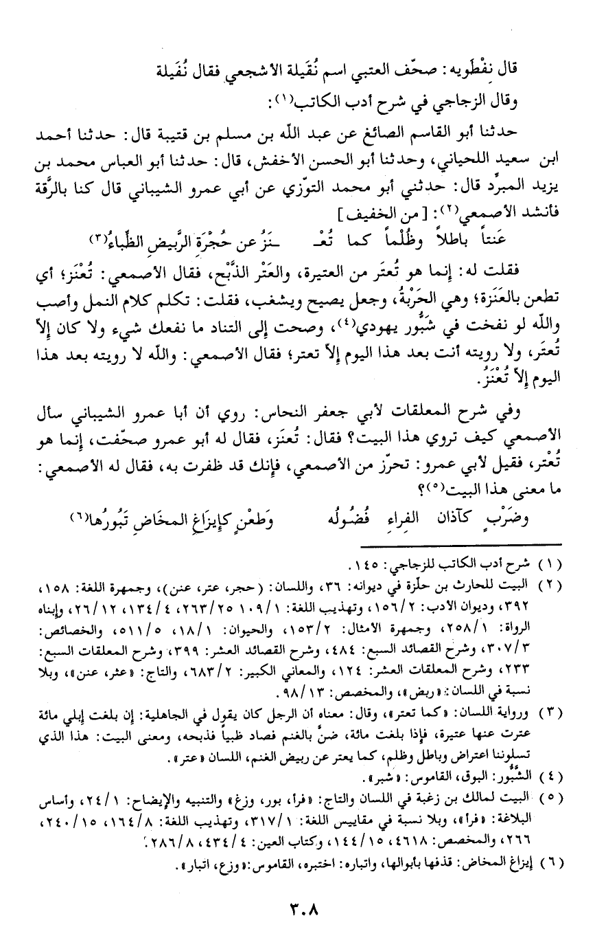 وفي شرح المعلقات لأبي جعفر النحاس: روى أن أبا عمرو الشيباني سأل الأصمعي كيف تروي هذا البيت فقال: تُعنَز، فقال له أبو عمرو صحفت، إنما هو تُعْتر، فقيل لأبي عمرو: تحرز من الأصمعي، فإنك قد ظفرت به، فقال له الأصمعي: ما معنى هذا البيت