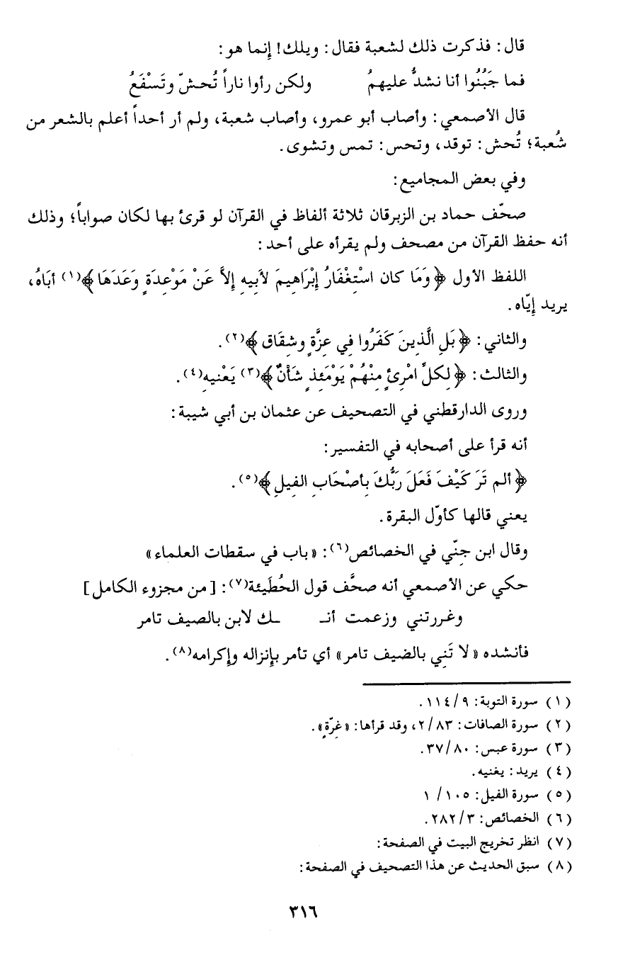 وروى الدارقطني في التصحيف عن عثمان بن أبي شيبة: أنه قرأ على أصحابة في التفسير: {ألم تَرَ كَيْفَ فَعَلَ رَبُّكَ بِأصْحَابِ الفِيلِ} .