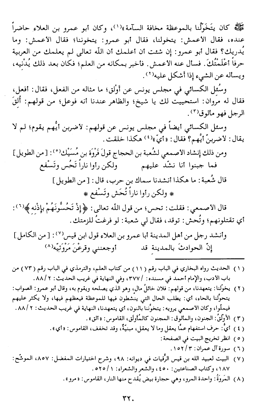 صلى الله عليه وسلم كان يتَخَوّلُنا بالموعظة مخافة السآمة، وكان أبو عمرو بن العلاء حاضرا عنده، فقال الأعمش، يتخولنا، فقال أبو عمرو: يتخوننا فقال الأعمش: وما يُدريك فقال أبو عمرو: إن شئت أن أعلمك أن الله تعالى لم يعلمك من العربية حرفا أعْلَمْتُكَ.