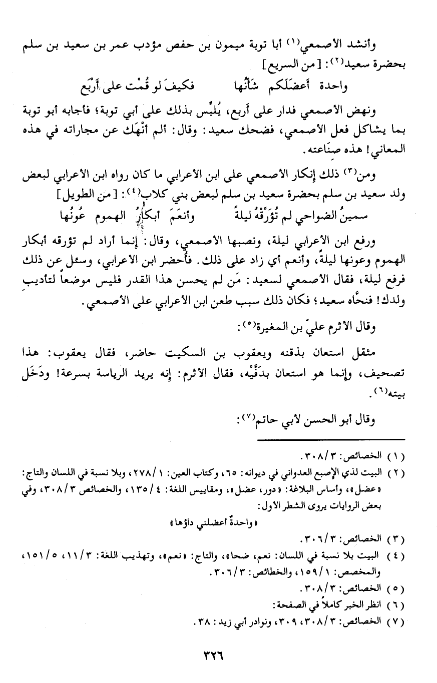 (واحدة أَعضَلَكم شَأْنُها ... فكيفَ لو قُمْت على أربع) // السريع // ونهض الأصمعي فدار على أَربع، يُلبِّس بذلك على أبي توبة فأجابه أبو توبة بما يشاكل فعل الأصمعي، فضحك سعيد: وقال: ألم أنْهَك عن مجاراته في هذه المعاني هذه صِنَاعته.
