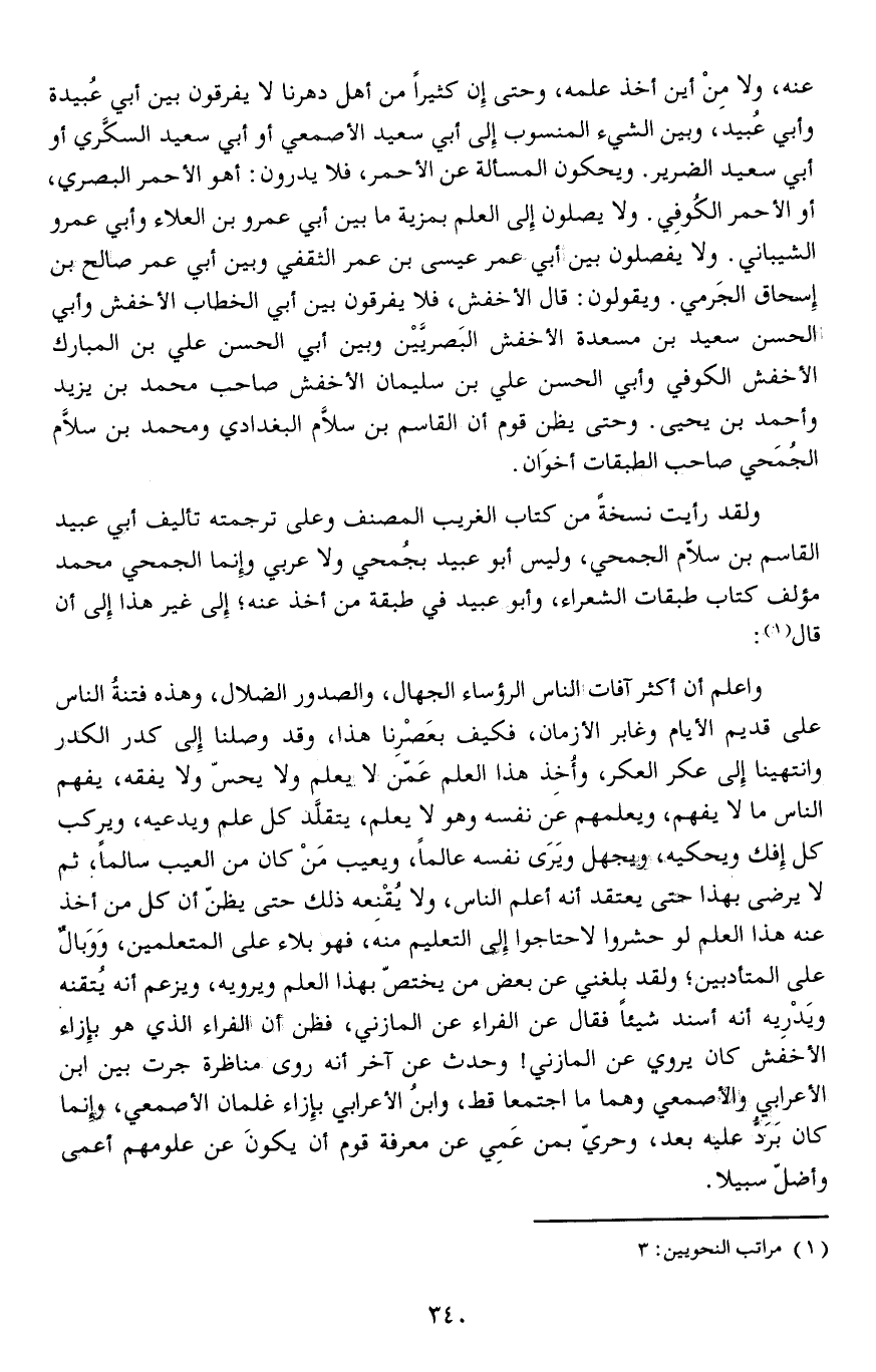 ولقد رأيت نسخة من كتاب الغريب المصنف وعلى ترجمته تأليف أبي عبيد القاسم بن سلام الجمحي، وليس أبو عبيد بجُمحي ولا عربي وإنما الجمحي محمد مؤلف كتاب طبقات الشعراء، وأبو عبيد في طبقة من أخذ عنه إلى غير هذا إلى أن قال واعلم أن أكثر آفات الناس الرؤساء الجهال، والصدور الضلال، وهذه فتنةُ الناس على قديم الأيام وغابر الأزمان، فكيف بعَصْرِنا هذا، وقد وصلنا إلى كدر الكدر وانتهينا إلى عكر العكر، وأُخِذ هذا العلم عَمّن لا يعلم ولا يحس ولا يفقه، يفهم الناس ما لا يفهم، ويعلمهم عن نفسه وهو لا يعلم، يتقلَّد كل علم ويدعيه، ويركب كل إفك ويحكيه، ويجهل ويَرَى نفسه عالما، ويعيب مَنْ كان من العيب سالما، ثم لا يرضى بهذا حتى يعتقد أنه أعلم الناس، ولا يُقْنِعه ذلك حتى يظن أن كل من أخذ عنه هذا العلم لو حشروا لاحتاجوا إلى التعليم منه، فهو بلاء على المتعلمين، وَوَبالٌ على المتأدبين ولقد بلغني عن بعض من يختص بهذا العلم ويرويه، ويزعم أنه يُتقنه ويَدْرِيه أنه أسند شيئا فقال عن الفراء عن المازني، فظن أن الفراء الذي هو بإزاء الأخفش كان يروي عن المازني وحدث عن آخر أنه روى مناظرة جرت بين ابن الأعرابي والأصمعي وهما ما اجتمعا قط، وابنُ الأعرابي بإزاء غلمان الأصمعي، وإنما كان بَرَدُّ عليه بعد، وحري بمن عَمِي عن معرفة قوم أن يكونَ عن علومهم أعمى وأضل سبيلا.