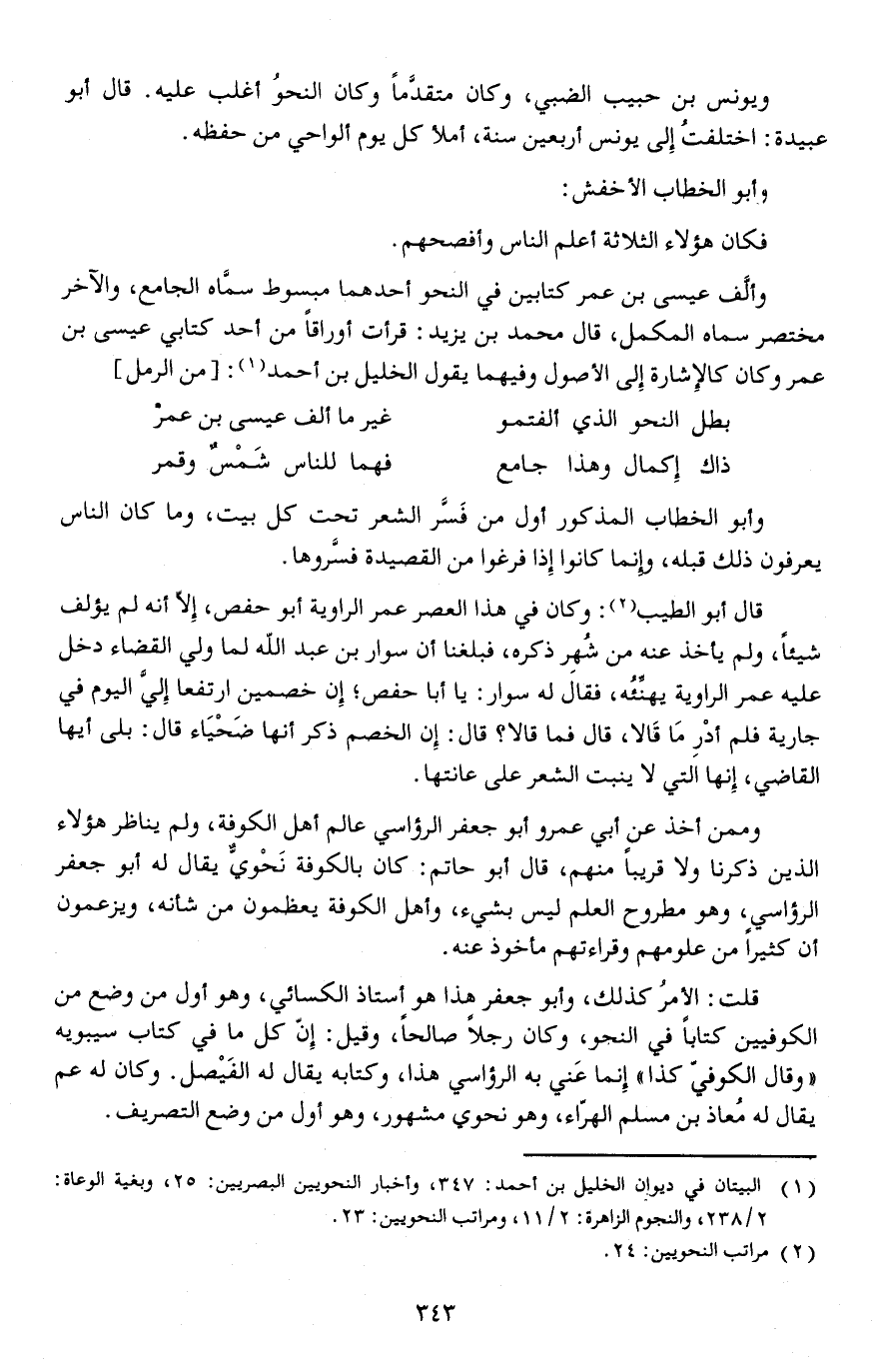قلت: الأمرُ كذلك، وأبو جعفر هذا هو أستاذ الكسائي، وهو أول من وضع من الكوفيين كتابا في النحو، وكان رجلا صالحا، وقيل: إن كل ما في كتاب سيبويه وقال الكوفي كذا إنما عَني به الرؤاسي هذا، وكتابه يقال له الفَيْصل.