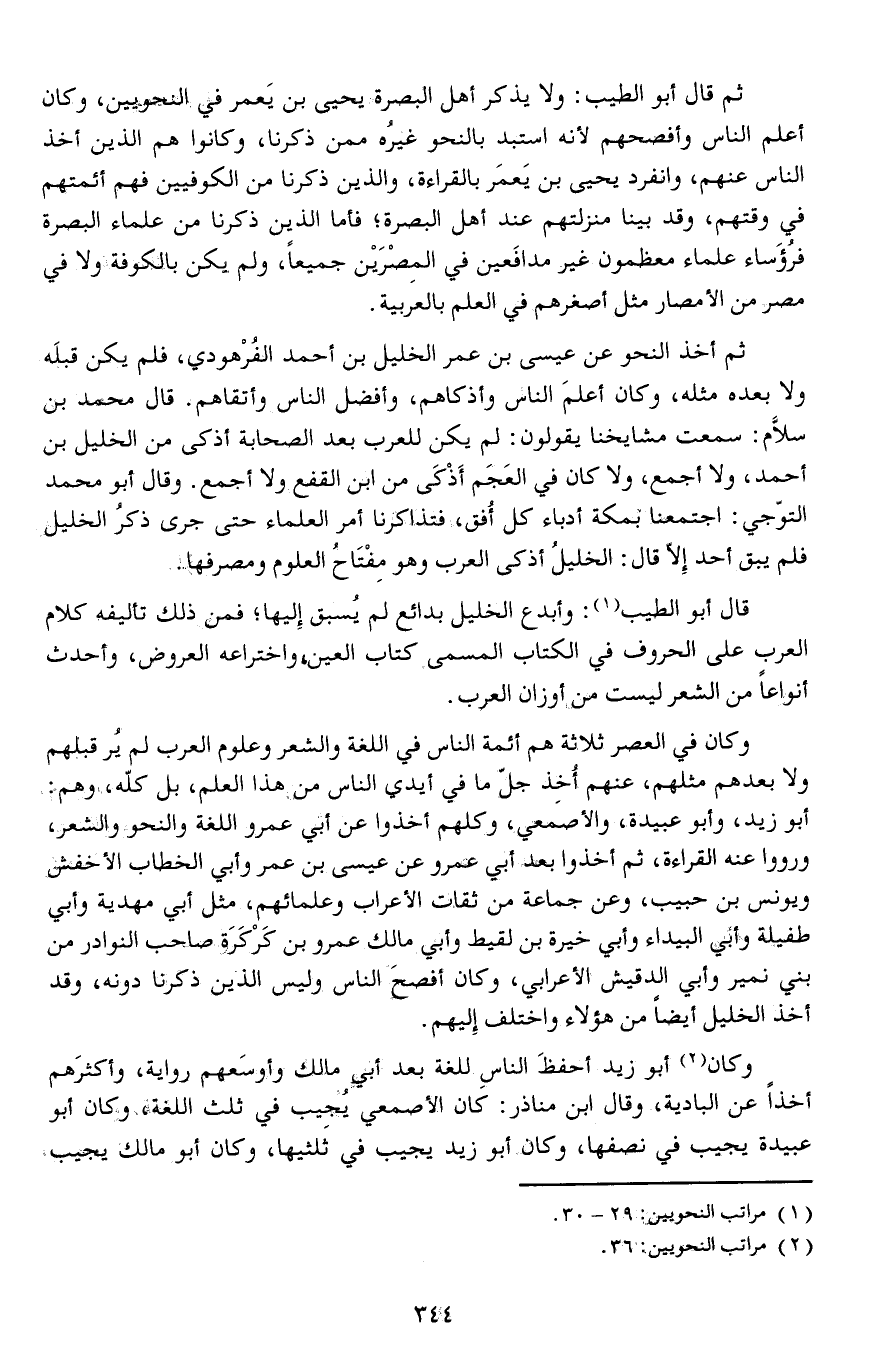 ثم قال أبو الطيب: ولا يذكر أهل البصرة يحيى بن يَعمر في النحويين، وكان أعلم الناس وأفصحهم لأنه استبد بالنحو عبره ممن ذكرنا، وكانوا هم الذين أخذ الناس عنهم، وانفرد يحيى بن يَعمَر بالقراءة، والذين ذكرنا من الكوفيين فهم أئمتهم في وقتهم، وقد بينا منزلتهم عند أهل البصرة فأما الذين ذكرنا من علماء البصرة فرُؤَساء علماء معظمون غير مدافَعين في المِصْرَيْن جميعا، ولم يكن بالكوفة ولا في مصر من الأمصار مثل أصغرهم في العلم بالعربية.