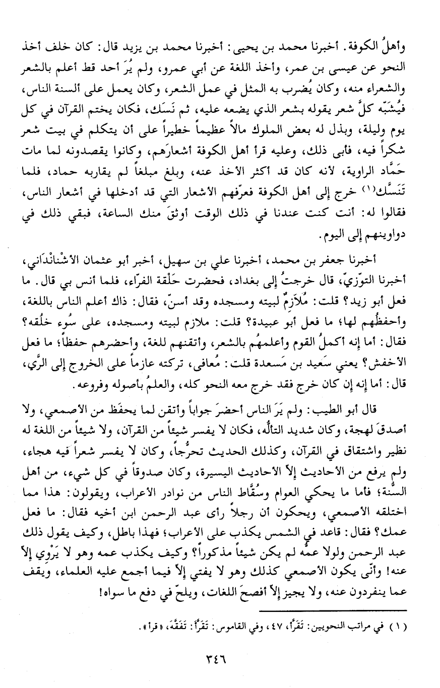 أخبرنا جعفر بن محمد، أخبرنا علي بن سهيل، أخبر أبو عثمان الأشْنانْدَاني، أخبرنا التوزي، قال خرجتُ إلى بغداد، فحضرت حَلْقة الفراء، فلما أنس بي قال.