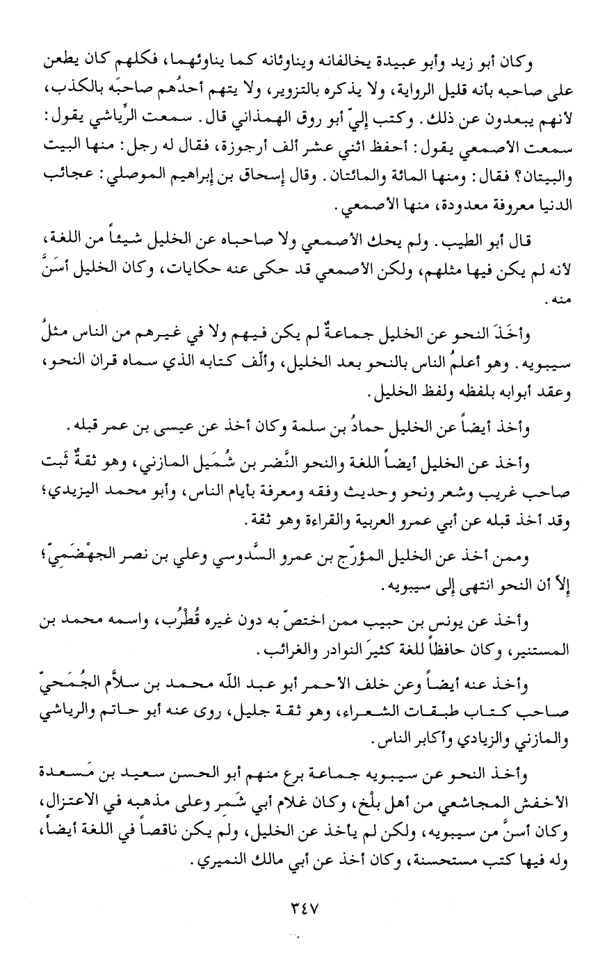 ولم يحك الأصمعي ولا صاحباه عن الخليل شيئا من اللغة، لأنه لم يكن فيها مثلهم، ولكن الأصمعي قد حكى عنه حكايات، وكان الخليل أسَنَّ منه.