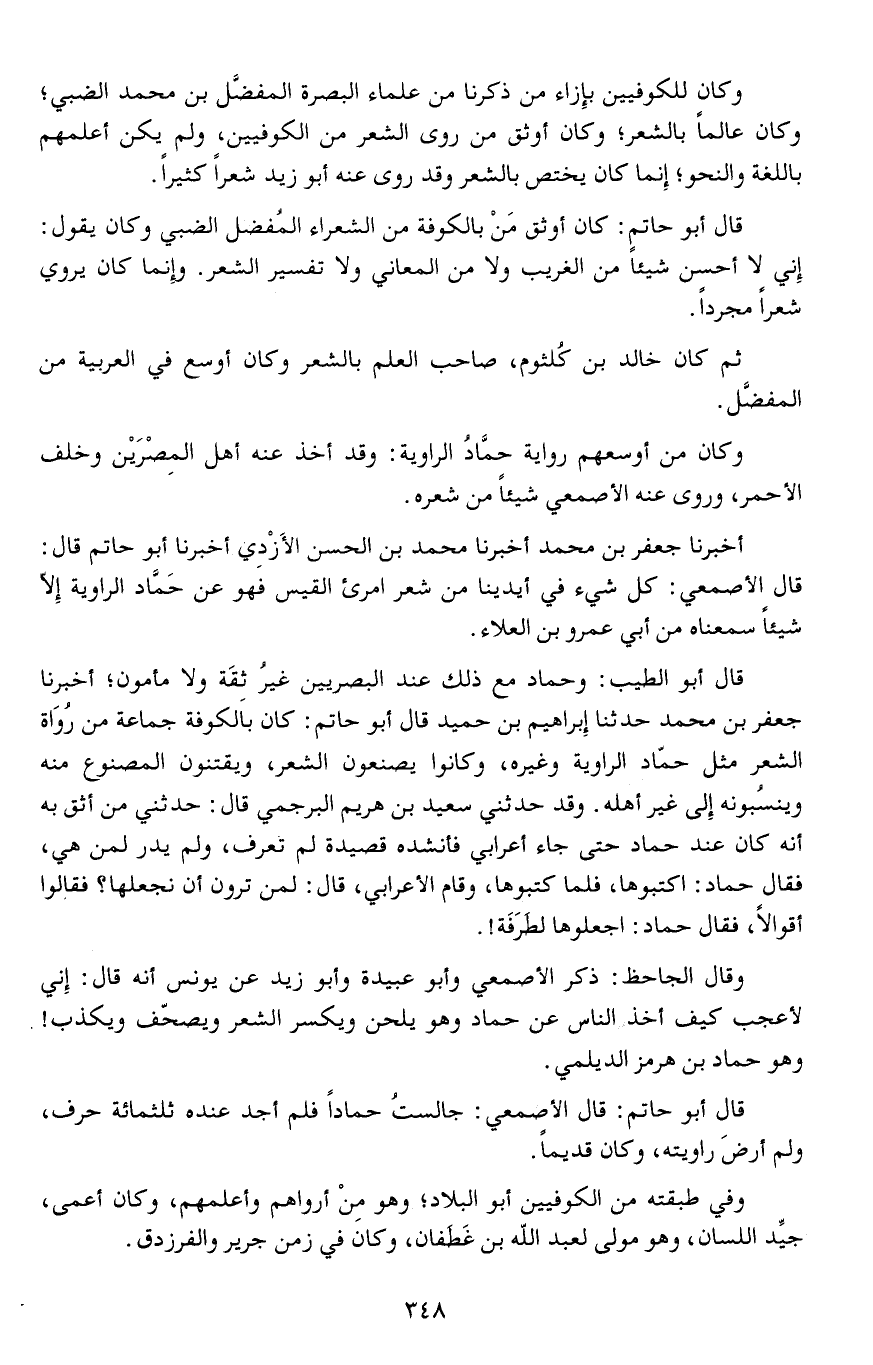 قال أبو الطيب: وحماد مع ذلك عند البصريين غيرُ ثِقَة ولا مأمون أخبرنا جعفر بن محمد حدثنا إبراهيم بن حميد قال أبو حاتم: كان بالكوفة جماعة من رُوَاة الشعر مثل حماد الراوية وغيره، وكانو يصنعون الشعر، ويقتنون المصنوع منه وينسُبونه إلى غير أهله.