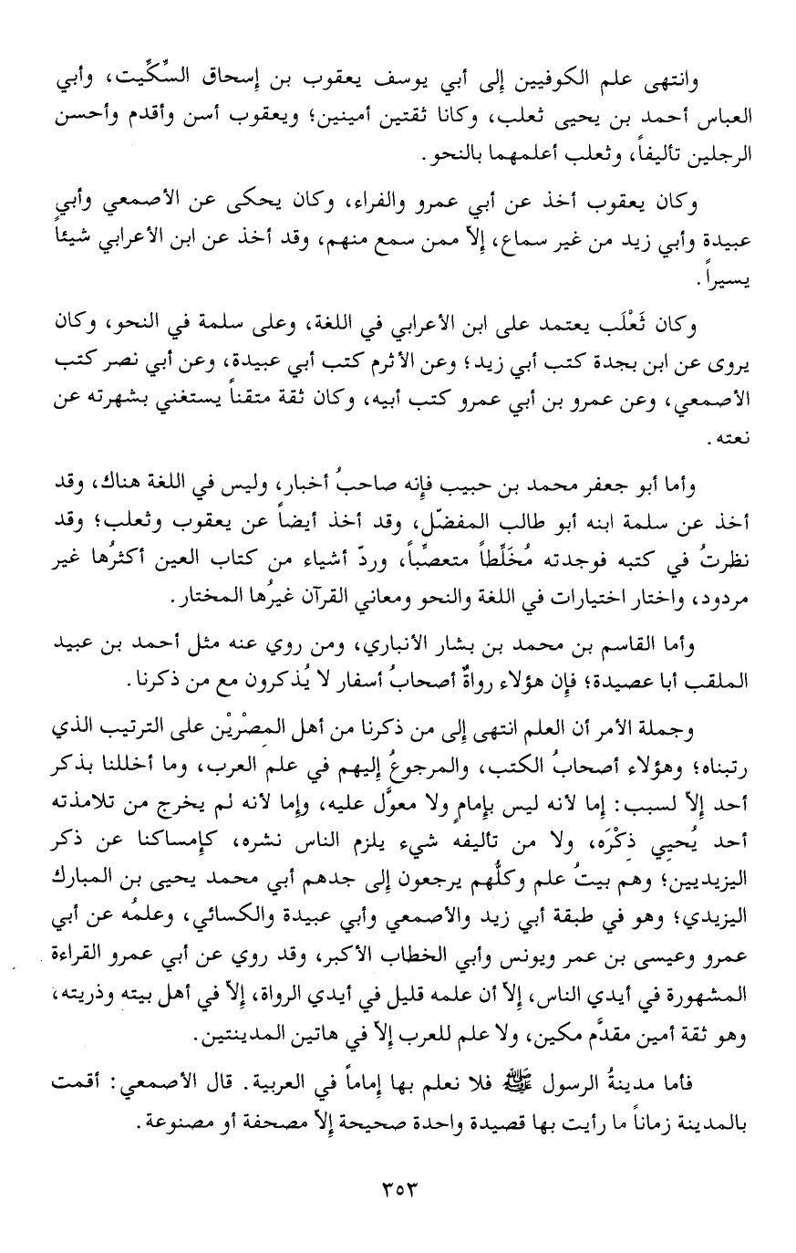 وجملة الأمر أن العلم انتهى إلى من ذكرنا من أهل المِصْريْن على الترتيب الذي رتبناه وهؤلاء أصحابُ الكتب، والمرجوعُ إليهم في علم العرب، وما أخللنا بذكر أحد إلا لسبب: إما لأنه ليس بإمامٍ ولا معوَّل عليه، وإما لأنه لم يخرج من تلامذته أحد يُحيِي ذِكْرَه، ولا من تأليفه شيء يلزم الناس نشره، كإمساكنا عن ذكر اليزيديين وهم بيتُ علم وكلُّهم يرجعون إلى جدهم أبي محمد يحيى بن المبارك اليزيدي وهو في طبقة أبي زيد والأصمعي وأبي عبيدة والكسائي، وعلمُه عن أبي عمرو وعيسى بن عمر ويونس وأبي الخطاب الأكبر، وقد روي عن أبي عمرو القراءة المشهورة في أيدي الناس، إلا أن علمه قليل في أيدي الرواة، إلا في أهل بيته وذريته، وهو ثقة أمين مقدَّم مكين، ولا علم للعرب إلا في هاتين المدينتين.