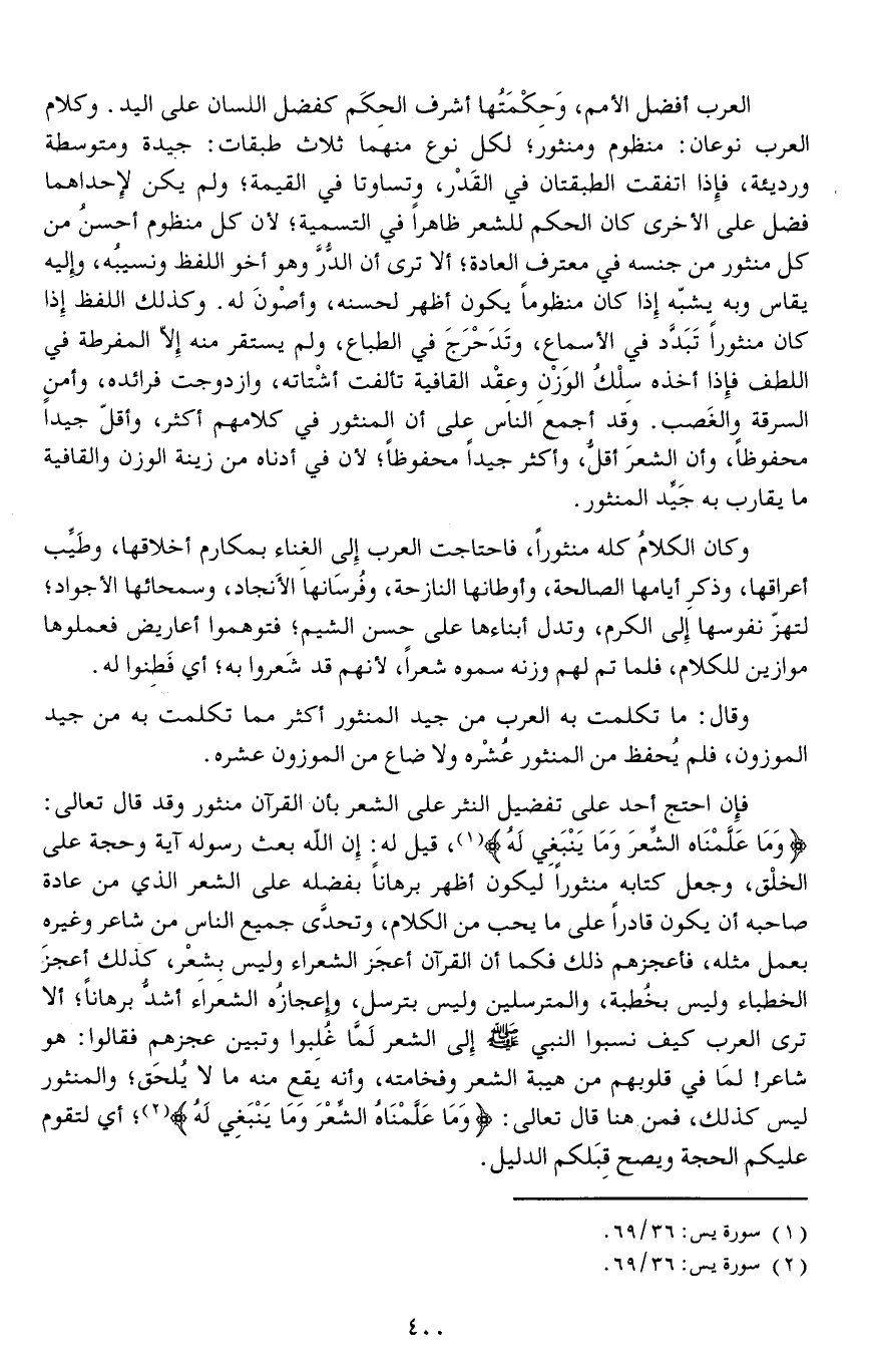 فإن احتج أحد على تفضيل النثر على الشعر بأن القرآن منثور وقد قال تعالى: {وَمَا عَلَّمْنَاه الشِّعرَ وَمَا يَنْبَغِي لَهُ} ، قيل له: إن الله بعث رسوله آية وحجة على الخلْق، وجعل كتابه منثورا ليكون أظهر برهانا بفضله على الشعر الذي من عادة صاحبه أن يكون قادرا على ما يحب من الكلام، وتحدَّى جميع الناس من شاعر وغيره بعمل مثله، فأعجزهم ذلك فكما أن القرآن أعجَز الشعراء وليس بِشِعْر، كذلك أعجزَ الخطباء وليس بخُطبة، والمترسلين وليس بترسل، وإعجازُه الشعراء أشدُّ برهانا ألا ترى العرب كيف نسبوا النبي صلى الله عليه وسلم إلى الشعر لَمَّا غُلِبوا وتبين عجزهم فقالوا: هو شاعر لمَا في قلوبهم من هيبة الشعر وفخامته، وأنه يقع منه ما لا يُلحَق والمنثور ليس كذلك، فمن هنا قال تعالى: {وَمَا عَلَّمْنَاهُ الشِّعْرَ وَمَا يَنْبَغِي لَهُ} أي لتقوم عليكم الحجة ويصح قِبَلكم الدليل.
