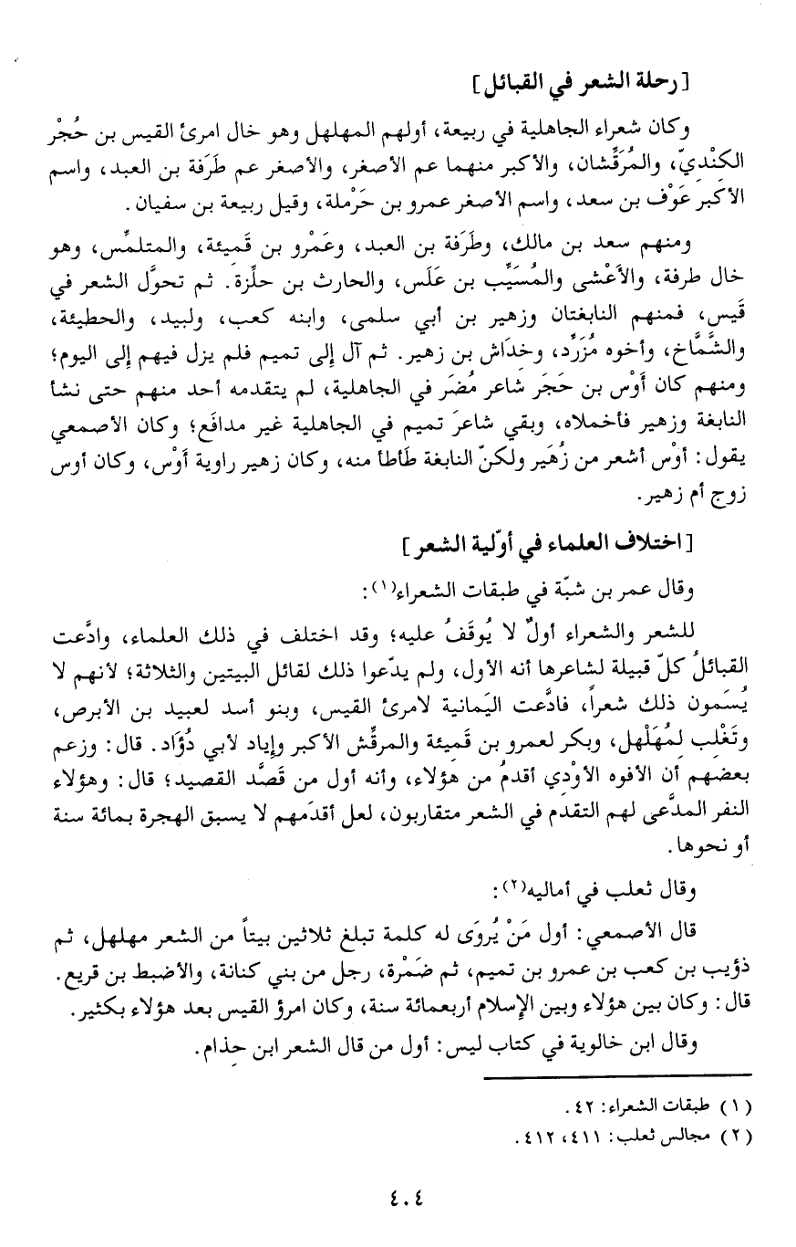 وقال عمر بن شبة في طبقات الشعراء: للشعر والشعراء أولٌ لا يُوقَفُ عليه وقد اختلف في ذلك العلماء، وادَّعت القبائلُ كل قبيلة لشاعرها أنه الأول، ولم يدعوا ذلك لقائل البيتين والثلاثة لأنهم لا يُسَمون ذلك شعرا، فادعت اليمانية لامرىء القيس، وبنو أسد لعبيد بن الأبرص، وتَغْلِب لِمُهَلْهل، وبكر لعمرو بن قَمِيئة والمرقِّش الأكبر وإياد لأبي دُؤَاد.
