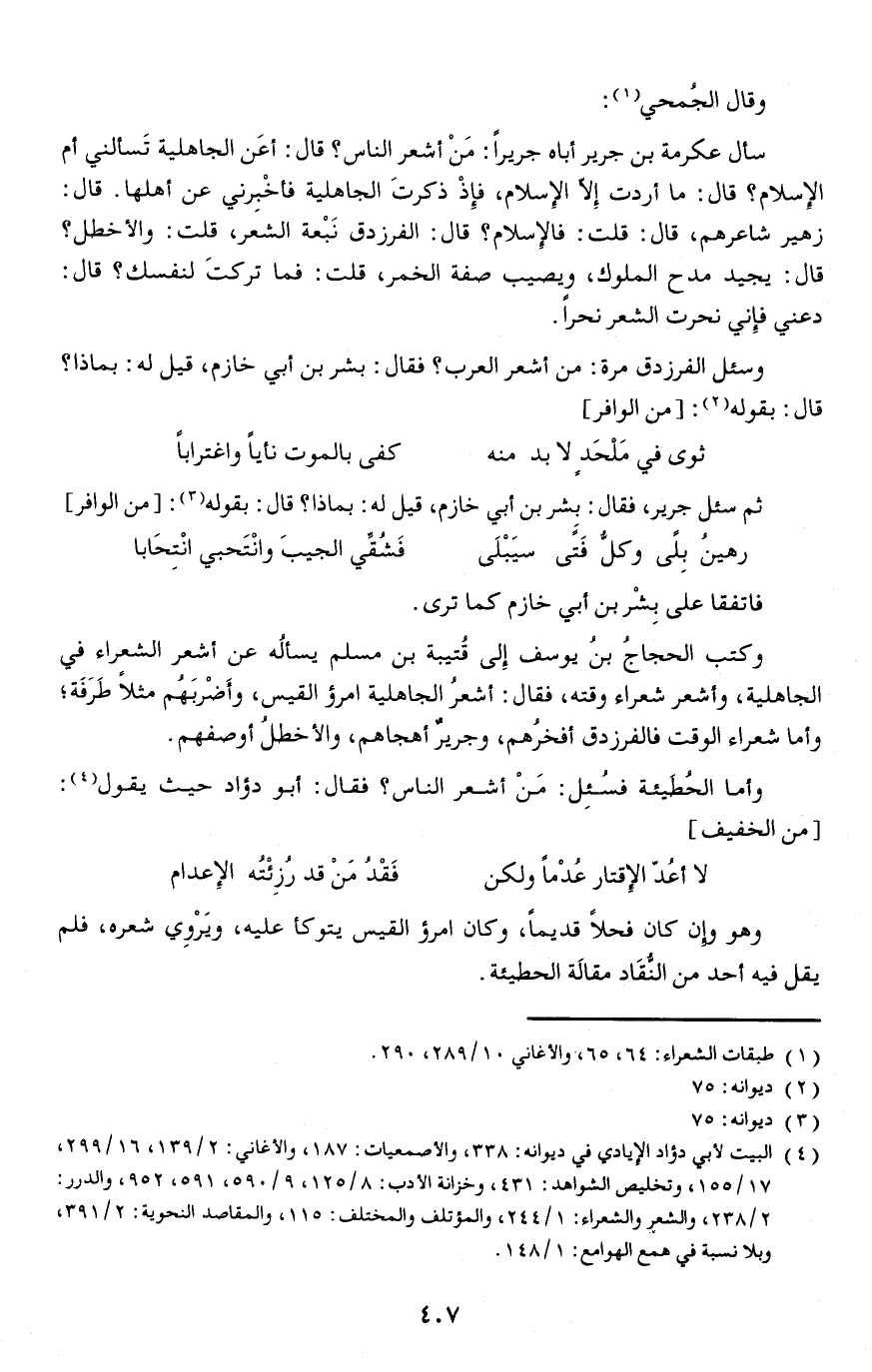 وقال الجُمحي: سأل عكرمة بن جرير أباه جريرا: مَنْ أشعر الناس قال: أعَن الجاهلية تَسألني أم الإسلام قال: ما أردت إلا الإسلام، فإذْ ذكرتَ الجاهلية فأخْبِرني عن أهلها.