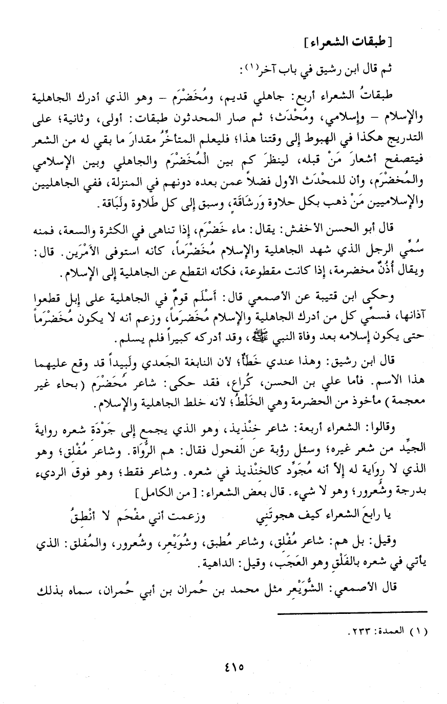 ثم قال ابن رشيق في باب آخر: طبقاتُ الشعراء أربع: جاهلي قديم، ومُخَضْرَم - وهو الذي أدرك الجاهلية والإسلام - وإسلامي، ومُحْدَث ثم صار المحدثون طبقات أولى، وثانية على التدريج هكذا في الهبوط إلى وقتنا هذا فليعلم المتأخِّرُ مقدارَ ما بقي له من الشعر فيتصفح أشعارَ مَنْ قبله، لينظرَ كم بين الْمُخَضْرَم والجاهلي وبين الإسلامي والمُخضْرَم، وأن للمحْدَث الأول فضلا عمن بعده دونهم في المنزلة، ففي الجاهليين والإسلاميين مَنْ ذهب بكل حلاوة وَرشَاقَةٍ، وسبق إلى كل طَلاوة ولَبَاقة.