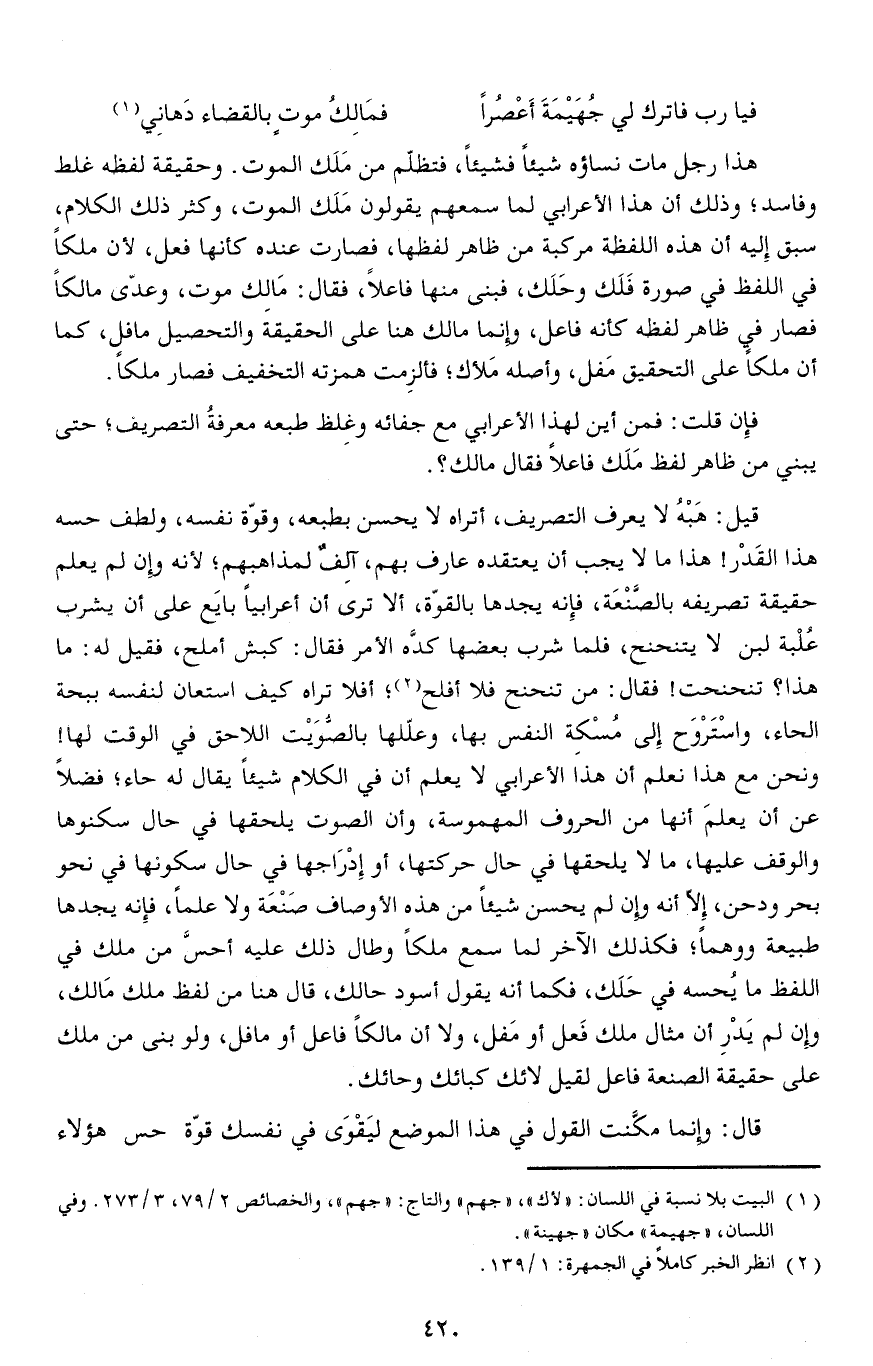 وحقيقة لفظه غلط وفاسد وذلك أن هاذ الأعرابي لما سمعم يقولون مَلَك الموت، وكثر ذلك الكلام، سبق إليه أن هذه اللفظة مركبة من ظاهر لفظها، فصارت عنده كأنها فعل، لأن ملكا في اللفظ في صورة فَلَك وحَلَك، فبنى منها فاعلا، فقال: مَالِك موت، وعدى مالكا فصار في ظاهر لفظه كأنه فاعل، وإنما مالك هنا على الحقيقة والتحصيل مافل، كما أن مالكا على التحقيق مَفل، وأصله مَلأك فألزِمت همزته التخفيف فصار ملكا.