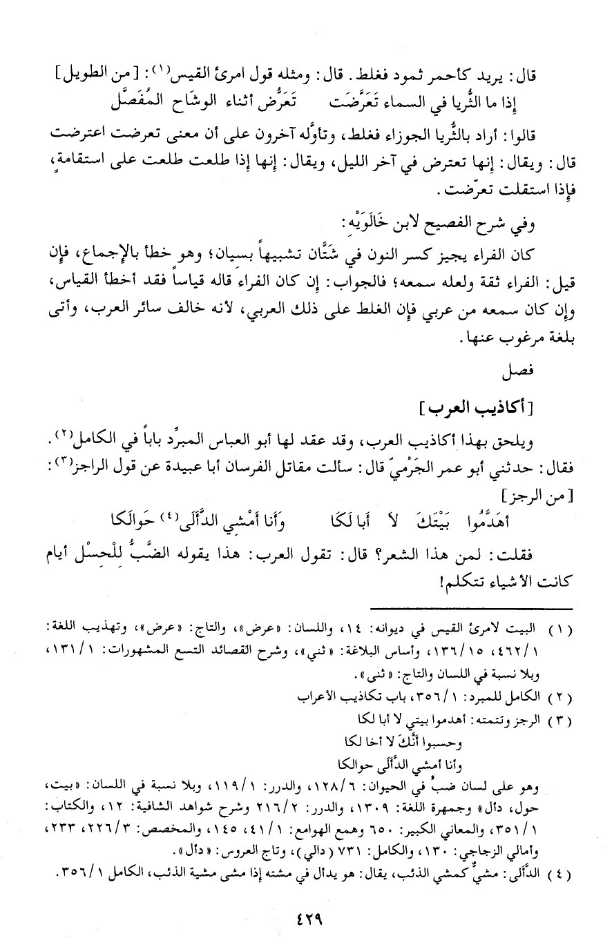 (إذا ما الثُّريا في السماء تَعَرَّضَت ... تعرض أثناء الوشاح المفضل) // الطويل // قالوا: أراد بالثُّريا الجوزاء فغلط، وتأوَّله آخرون على أن معنى تعرضت اعترضت قال: ويقال: إنها تعترض في آخر الليل، ويقال: إنها إذا طلعت طلعت على استقامةٍ، فإذا استقلت تعرضت.