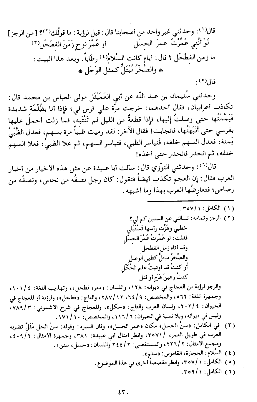 قال: وحدثني غير واحد من أصحابنا قال: قيل لرؤبة: ما قولُك