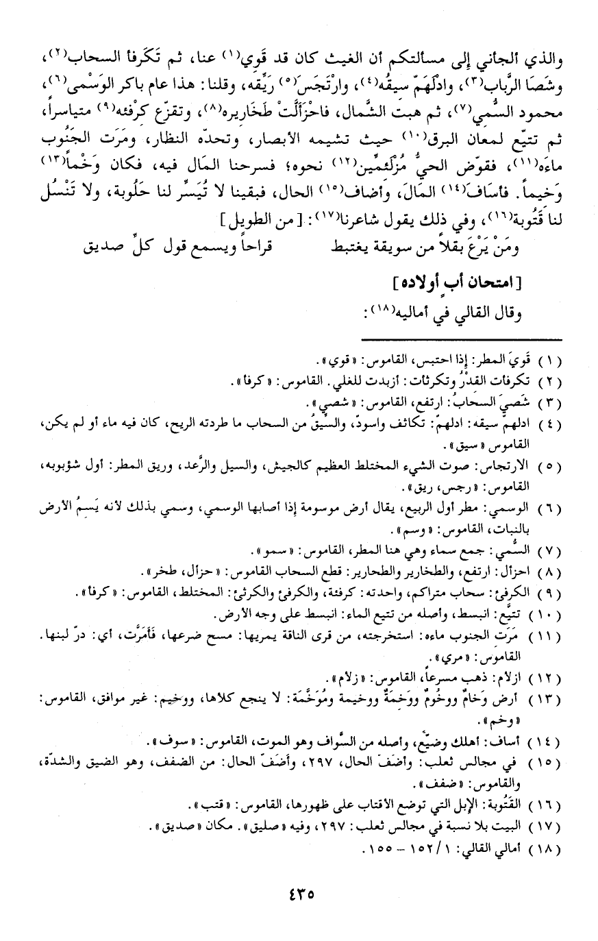 والذي ألجأني إلى مسألتكم أن الغيث كان قد قَوِي عنا، ثم تَكَرفأ السحاب، وشَصَا الرباب، والهم سِيقُه، وارْتَجَسَ رَيِّقه، وقلنا: هذا عام باكر الوَسْمي، محمود السُّمِي، ثم هبت الشَّمال، فاحْزَأَلَّتْ طخاريره، وتقزع كِرْفئه متياسرا، ثم تتيع لمعان البرق حيث تشيمه الأبصار، وتحده النظار، ومَرَت الجَنُوب ماءَه، فقوض الحيُّ مُزْلَئِمِّين نحوه فسرحنا المَال فيه، فكان وَخْماً وَخِيماً.