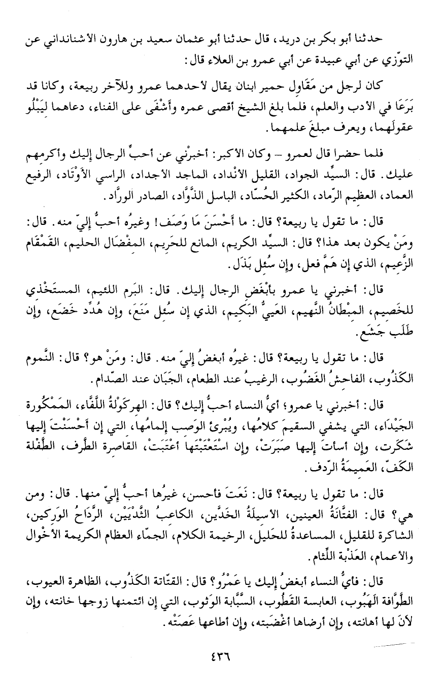 قال أخبرني يا عمرو أيُّ النساء أحبُّ إليك قال: الهِركَوْلةُ اللَّفَّاء، المَمْكُورة الجَيْدَاء، التي يشفي السقيمَ كلامُها، ويبرىء الوَصِب إلمامُها، ِالتي إن أَحْسَنْتَ إليها شَكَرت وإن أسأتَ إليها صَبَرَتْ، وإن اسْتَعْتَبْتَها أعْتَبَتْ، القاصِرة الطَّرف، الطَّفْلة الكَفّ، العَمِيمَةُ الردف.