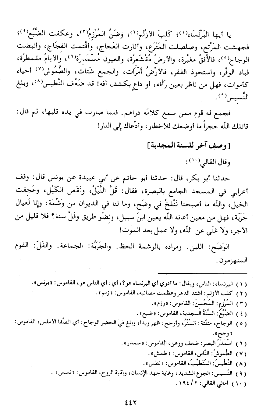 وقال القالي: حدثنا أبو بكر، قال: حدثنا أبو حاتم عن أبي عبيدة عن يونس قال: وقف أعرابي في المسجد الجامع بالبصرة، فقال: قَلَّ النَّيْلُ، ونَقَص الكَيْل، وعَجِفت الخيل، والله ما أصبحنا نَنْفخُ في وضَح، وما لنا في الديوان من وَشْمَة، وإنا لَعيال جَرَبّة، فهل من معين أعانه الله يعين ابنَ سبيل، ونِضْو طريق وفَلَّ سنة فلا قليل من الأجر، ولا غنَى عن الله، ولا عمل بعد الموت الوَضَح: اللبن.