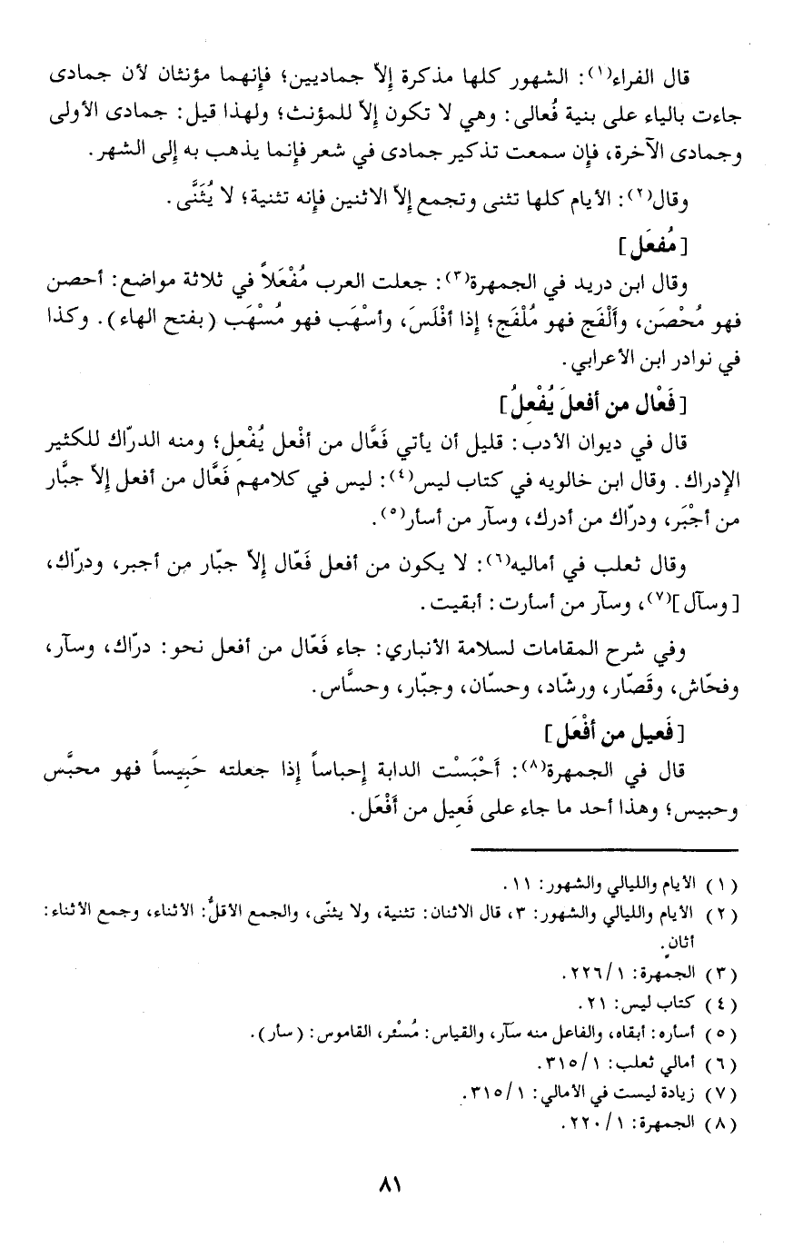 وقال ابن خالويه في كتاب ليس: ليس في كلامهم فَعَّال من أفعل إلا جبَّار من أجْبَر، ودراك من أدرك، وسآر من أسأر.