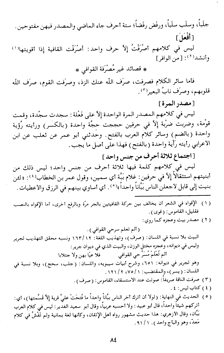 ليس في كلامهم أصْرَفْتُ إلا حرف واحد: أصرفت القافية إذا أقويتها وأنشد: [// من الوافر //] (قصائد غير مُصْرَفة القوافي)