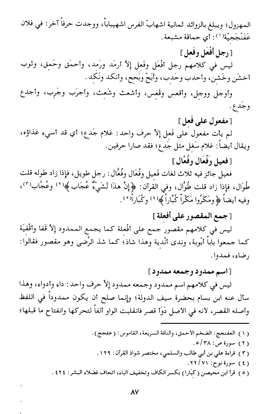 ليس في كلامهم مقصور جمع على أفْعِلة كما يجمع الممدود إلا قَفا وأقْفِيَة كما جمعوا بابا أبْوبة، وندى أنْدِية وهذا شاذ كما شذ الرِّضى وهو مقصور فقالوا: رضاء، فمدوا.