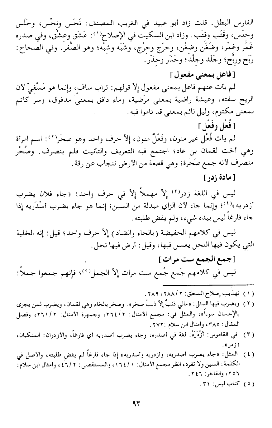 لم يأت عنهم فاعل بمعنى مفعول إلا قولهم: تراب سافٍ، وإنما هو مَسْفِيّ لأن الريح سفته، وعيشة راضية بمعنى مرَْضية، وماء دافق بمعنى مدفوق، وسر كاتم بمعنى مكتوم، وليل نائم بمعنى قد ناموا فيه.