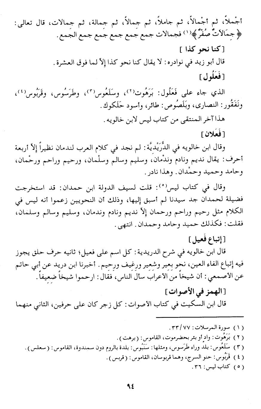 الذي جاء على فَعَلُول: بَرَهُوت، وسَلَعُوس، وطَرَسُوس، وقَرَبُوس، ونَفَقُور، النصارى، وبَلَصُوص: طائر، وأسود حَلَكوك.