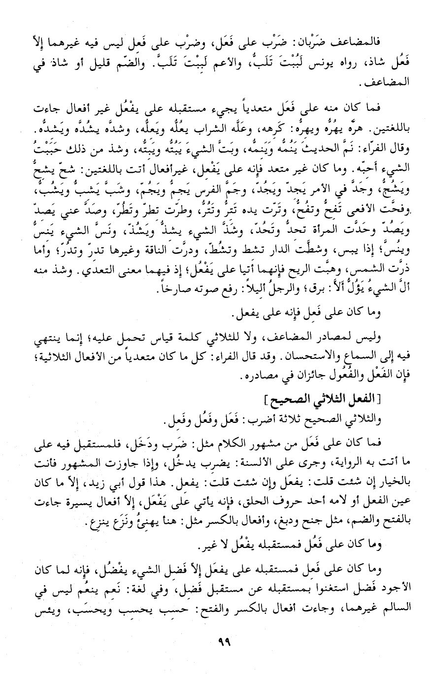 وما كان غير متعد فإنه على يَفْعِل، غير أفعال أتت باللغتين: شح يشِحُّ ويَشُحُّ، وجَدَّ في الأمر يَجِدّ ويَجُدّ، وجَمَّ الفرس يَجِمُّ ويَجُمّ، وشَبَّ يَشِبُّ ويَشُبُّ، وفحَّت الأفعى تَفِحُّ وتفُحُّ، وتَرّت يده تَتِرُّ وتَتُرُّ، وطرت تِطرّ وتَطُرّ، وصَدَّ عني يَصِدّ ويَصُدّ وحَدَّت المرأة تحِدُّ وتَحُدّ، وشَذَّ الشيء يشِذُّ ويَشُذّ، ونَسَّ الشيء يَنِسُّ وينُسَّ إذا يبس، وشطَّت الدار تشِط وتشُطّ، ودرَّت الناقة وغيرها تدِرّ وتدُرّ وأما ذرَّت الشمس، وهبَّت الريح فإنهما أتيا على يَفْعُل إذ فيهما معنى التعدي.