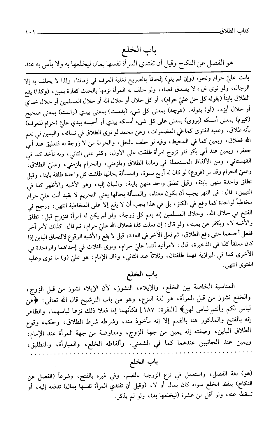 المناسبة الخاصة بين الخلع والإيلاء النشوز لأن الإيلاء نشوز من قبل الزوج والخلع نشوز من قبل المرأة هو لغة النزع وهو من باب الترشيح قال الله تعالى هن لباس لكم وأنتم لباس لهن فكأنهما إذا فعلا ذلك نزعا لباسهما والظاهر أنه بالفتح والمذكور هنا بالضم إلا أنه مأخوذ منه وشرطه شرط الطلاق وحكمه وقوع الطلاق البائن وصفته أنه يمين من جهة الزوج ومعارضة من جهة المرأة عند الإمام ويمين عند الجانبين عندهما كما في الشمني وألفاظه الخلع والمبارأة والتطليق