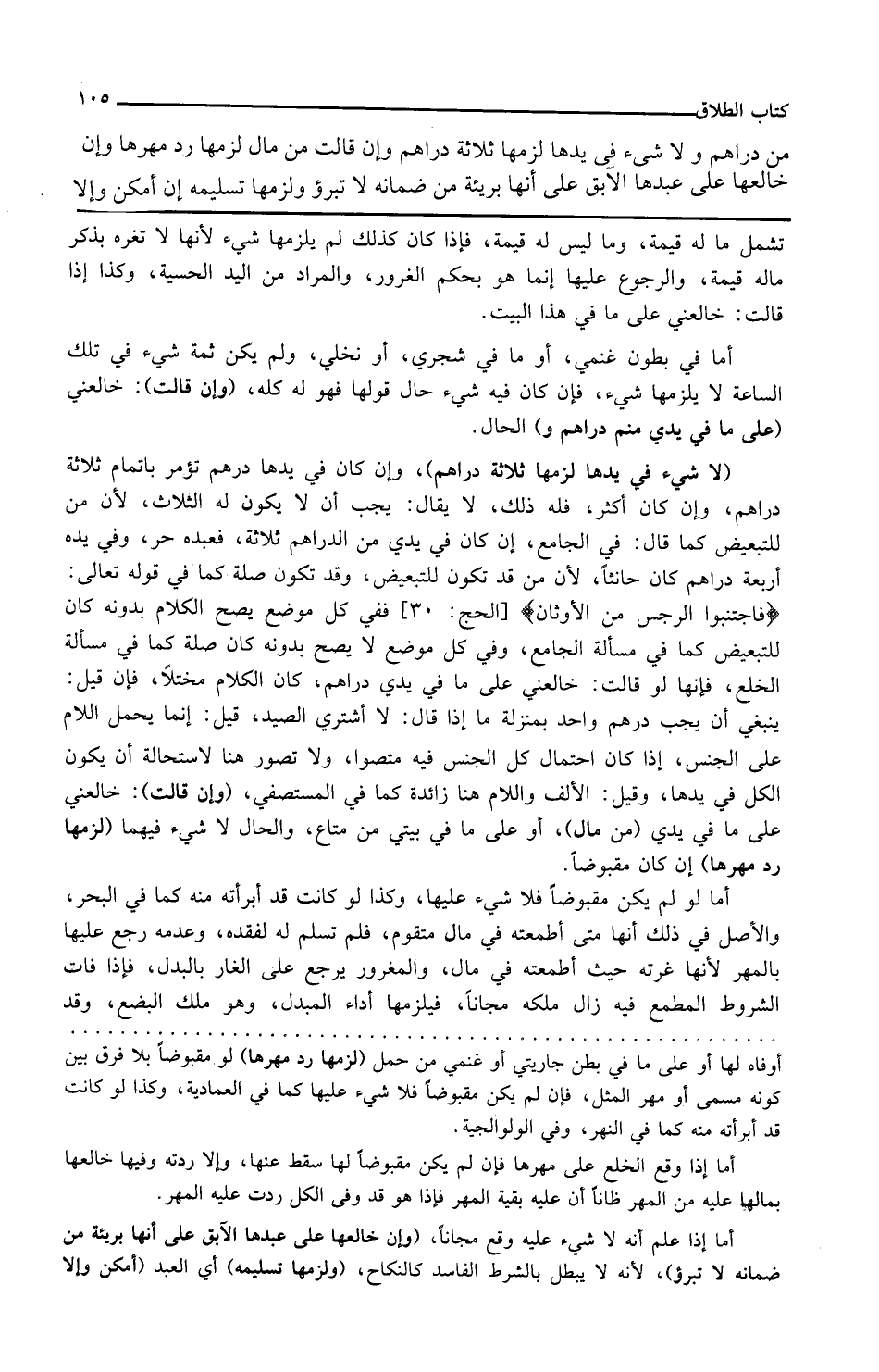 وإن قالت خالعني على ما في يدي من دراهم و الحال لا شيء في يدها لزمها ثلاثة دراهم وإن كان في يدها درهم تؤمر بإتمام ثلاثة دراهم وإن كان أكثر فله ذلك لا يقال يجب أن لا يكون له الثلاث لأن من للتبعيض كما قال في الجامع إن كان في يدي من الدراهم ثلاثة فعبده حر وفي يده أربعة دراهم كان حانثا لأن من قد تكون للتبعيض وقد تكون صلة كما في قوله تعالى فاجتنبوا الرجس من الأوثان ففي كل موضع يصح الكلام بدونه كان للتبعيض كما في مسألة الجامع وفي كل موضع لا يصح بدونه كان صلة كما في مسألة الخلع فإنها لو قالت خالعني على ما في يدي دراهم كان الكلام مختلا فإن قيل ينبغي أن يجب درهم واحد بمنزلة ما إذا قال لا أشتري الصيد قيل إنما يحمل الكلام على الجنس إذا كان احتمال كل الجنس فيه متصورا ولا تصور هنا لاستحالة أن يكون في يدها وقيل الألف واللام هنا زائدة كما في المستصفى