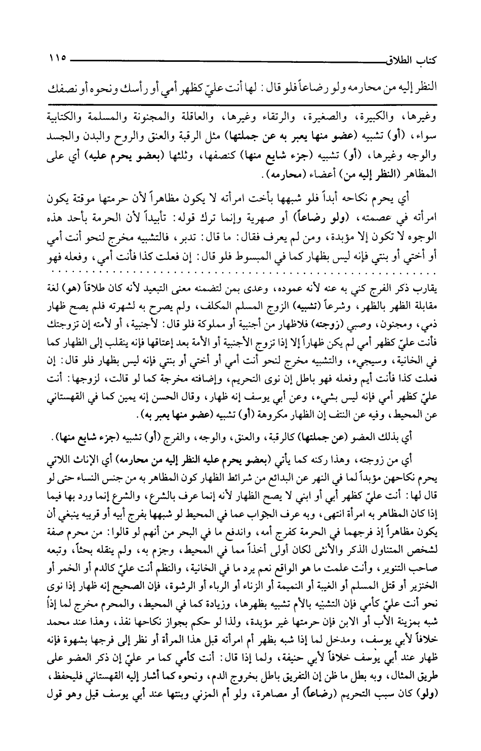 وغيرها والكبيرة والصغيرة والرتقاء وغيرها والعاقلة والمجنونة والمسلمة والكتابية سواء أو تشبيه عضو منها يعبر به عن جملتها مثل الرقبة والعنق والروح والبدن والجسد والوجه وغيرها أو تشبيه جزء شائع منها كنصفها وثلثها بعضو يحرم عليه أي على المظاهر النظر إليه من أعضاء محارمه أي يحرم نكاحه أبدا فلو شبهها بأخت امرأته لا يكون مظاهرا لأن حرمتها موقتة بكون امرأته في عصمته