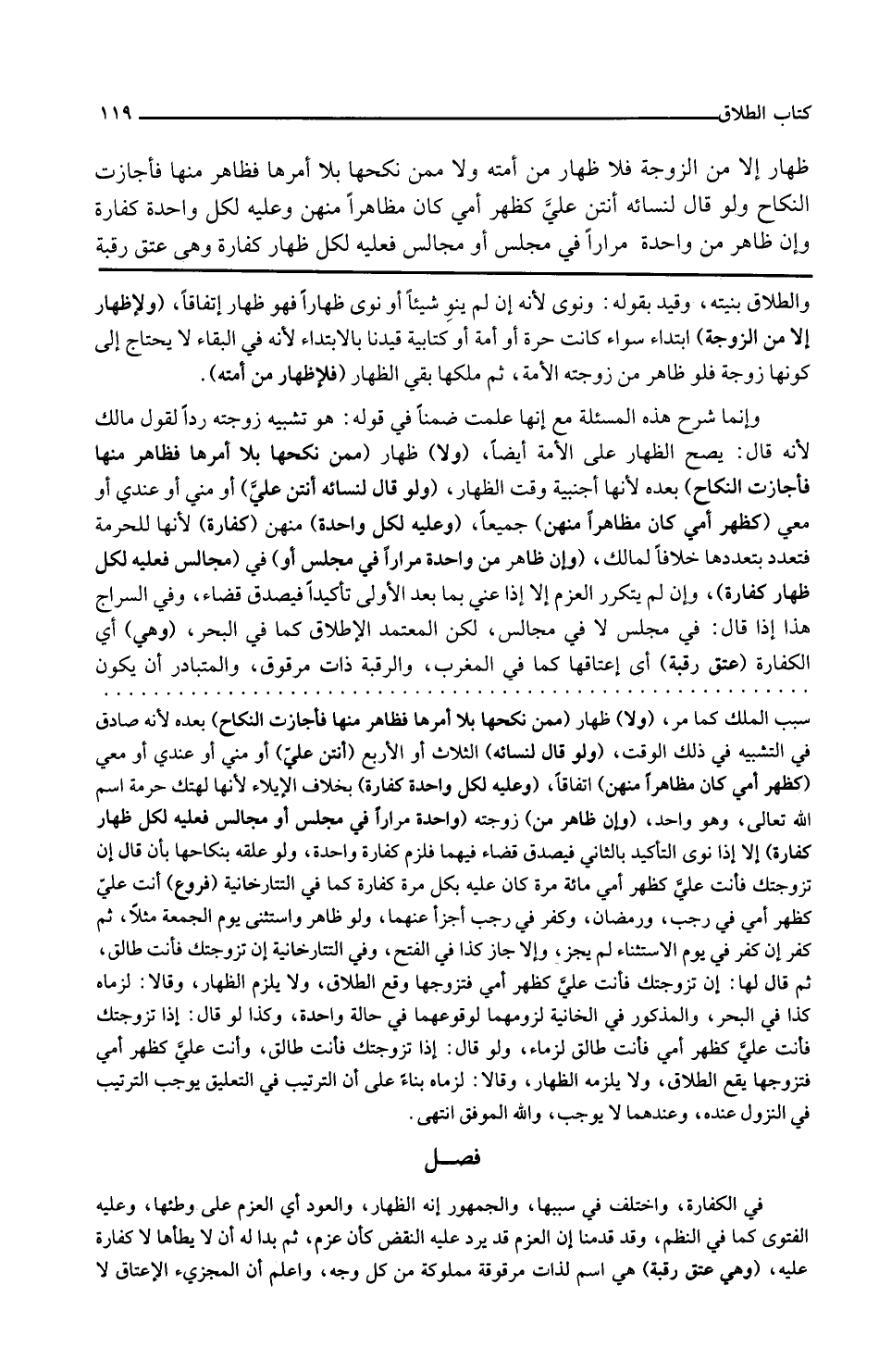 والطلاق بنيته وقيد بقوله ونوى لأنه إن لم ينو شيئا أو نوى ظهارا فهو ظهار اتفاقا ولا ظهار إلا من الزوجة ابتداء سواء كانت حرة أو أمة أو كتابية قيدنا بالابتداء لأنه في البقاء لا يحتاج إلى كونها زوجة فلو ظاهر من زوجته الأمة ثم ملكها بقي الظهار فلا ظهار من أمته وإنما شرح هذه المسألة مع أنها علمت ضمنا في قوله هو تشبيه زوجته ردا لقول مالك لأنه قال يصح الظهار على الأمة أيضا ولا ظهار ممن نكحها بلا أمرها فظاهر منها فأجازت النكاح بعده لأنها أجنبية وقت الظهار