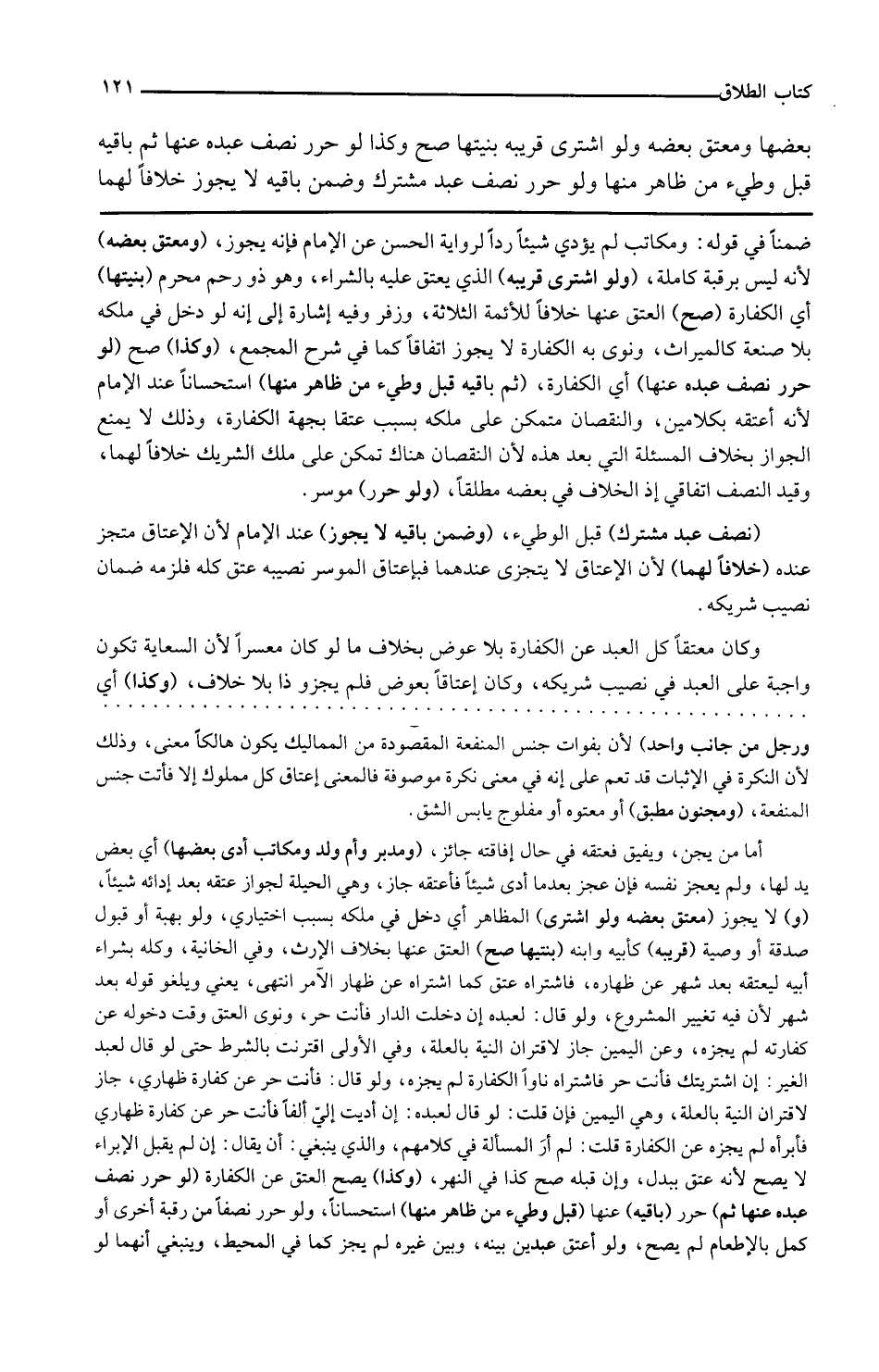 وكذا صح لو حرر نصف عبده عنها أي الكفارة ثم باقيه قبل وطء من ظاهر منها استحسانا عند الإمام لأنه أعتقه بكلامين والنقصان متمكن على ملكه بسبب عتاق بجهة الكفارة وذلك لا يمنع الجواز بخلاف المسألة التي بعد هذه لأن النقصان هناك تمكن على ملك الشريك خلافا لهما وقيد النصف اتفاقي إذ الخلاف في بعضه مطلقا ولو حرر موسر نصف عبد مشترك قبل الوطء وضمن باقيه لا يجوز عند الإمام لأن الإعتاق منجز عنده خلافا لهما لأن الإعتاق لا يتجزأ عندهما فبإعتاق الموسر نصيبه عتق كله فلزمه ضمان نصيب شريكه وكان معتقا كل العبد عن الكفارة بلا عوض بخلاف ما لو كان معسرا لأن السعاية تكون واجبة على العبد في نصيب شريكه وكان إعتاقا بعوض فلم يجز وذا بلا خلاف