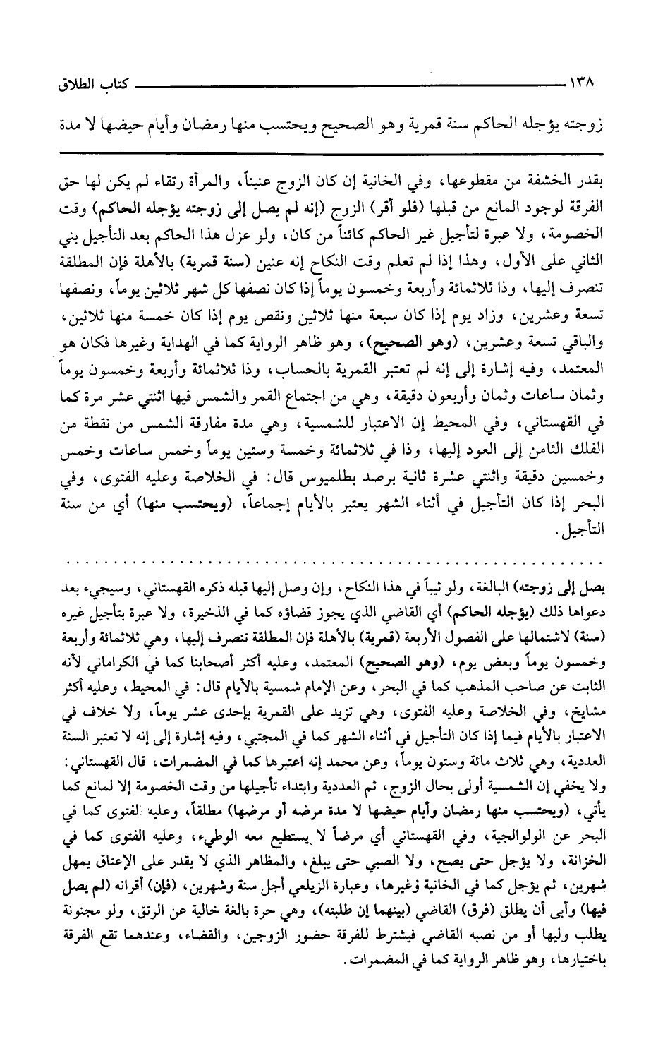 وفي الخانية إن كان الزوج عنينا والمرأة رتقاء لم يكن لها حق الفرقة لوجود المانع من قبلها فلو أقر الزوج أنه لم يصل إلى زوجته يؤجله الحاكم وقت الخصومة ولا عبرة لتأجيل غير الحاكم كائنا من كان ولو عزل هذا الحاكم بعد التأجيل بنى الثاني على الأول وهذا إذا لم تعلم وقت النكاح أنه عنين سنة قمرية بالأهلة فإن المطلقة تنصرف إليها وذا ثلاثمائة وأربعة وخمسون يوما إذا كان نصفها كل شهر ثلاثين يوما ونصفها تسعة وعشرين وزاد يوم إذا كان سبعة منها ثلاثين ونقص يوم إذا كان خمسة منها ثلاثين والباقي تسعة وعشرين وهو الصحيح وهو ظاهر الرواية كما في الهداية وغيرها فكان هو المعتمد وفيه إشارة إلى أنه لم تعتبر القمرية بالحساب وذا ثلاثمائة وأربعة وخمسون يوما وثمان ساعات وثمان وأربعون دقيقة وهي من اجتماع القمر والشمس فيها اثنتي عشر مرة كما في القهستاني