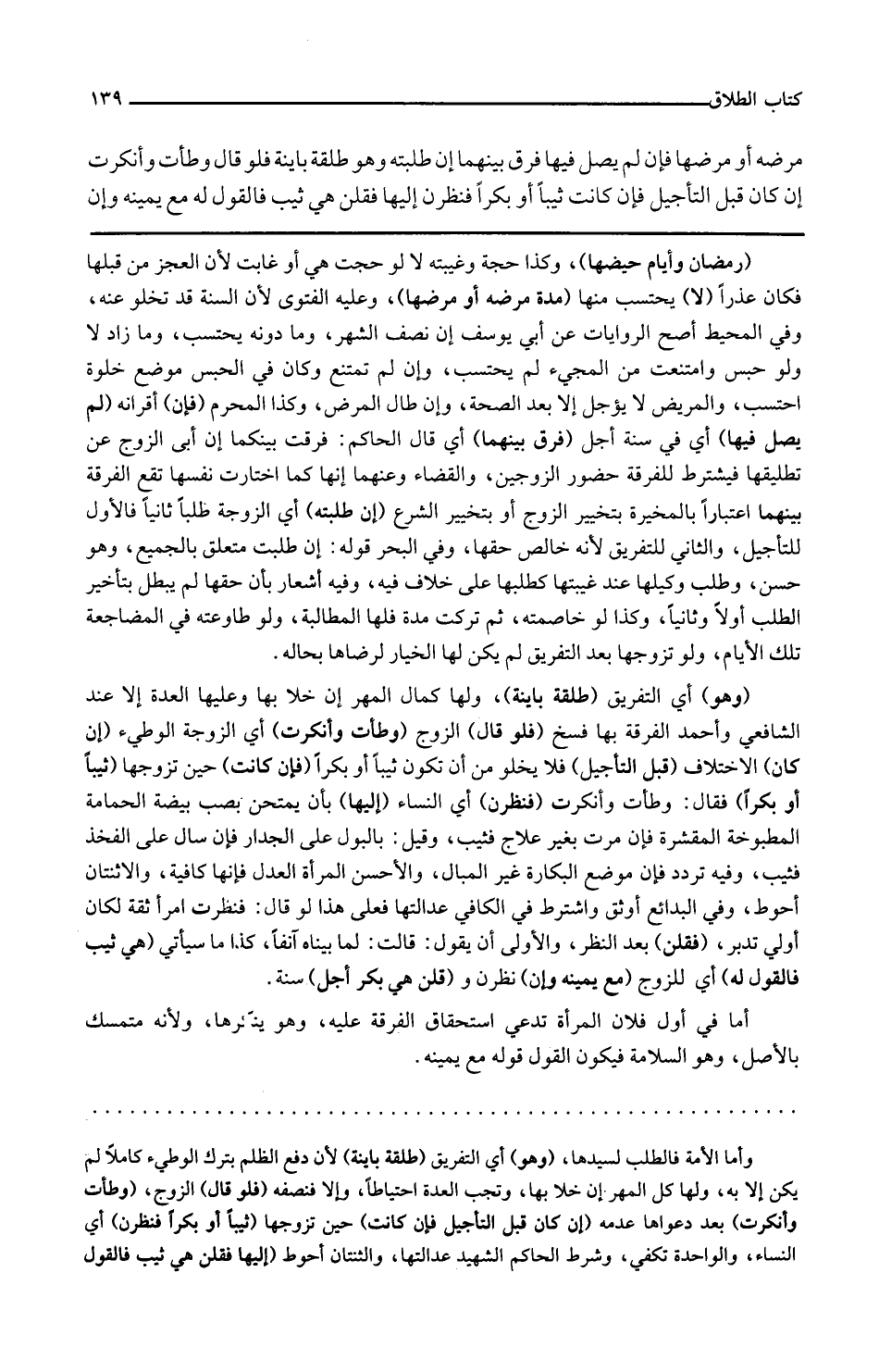 وفي المحيط أصح الروايات عن أبي يوسف أن نصف الشهر وما دونه يحتسب وما زاد لا ولو حبس وامتنعت من المجيء لم يحتسب وإن لم تمتنع وكان في الحبس موضع خلوة احتسب والمريض لا يؤجل إلا بعد الصحة وإن طال المرض وكذا المحرم فإن أقر أنه لم يصل فيها أي في سنة أجل فرق بينهما أي قال الحاكم فرقت بينكما إن أبى الزوج عن تطليقها فيشترط للفرقة حضور الزوجين والقضاء وعنهما أنها كما اختارت نفسها تقع الفرقة بينهما اعتبارا بالمخيرة بتخيير الزوج أو بتخيير الشرع إن طلبته أي الزوجة طلبا ثانيا فالأول للتأجيل والثاني للتفريق لأنه خالص حقها وفي البحر قوله إن طلبت متعلق بالجميع وهو حسن وطلب وكيلها عند غيبتها كطلبها على خلاف فيه وفيه إشعار بأن حقها لم يبطل بتأخير الطلب أولا وثانيا وكذا لو خاصمته ثم تركت مدة فلها المطالبة ولو طاوعته في المضاجعة تلك الأيام ولو تزوجها بعد التفريق لم يكن لها الخيار لرضاها بحاله وهو أي التفريق طلقة بائنة ولها كمال المهر إن خلا بها وعليها العدة إلا عند الشافعي وأحمد الفرقة بها فسخ فلو قال الزوج وطئت وأنكرت أي الزوجة الوطء إن كان الاختلاف قبل التأجيل فلا يخلو من أن تكون ثيبا أو بكرا فإن كانت حين تزوجها ثيبا أو بكرا فقال وطئت وأنكرت فنظرن أي النساء إليها بأن يمتحن بصب بيضة الحمامة المطبوخة المقشرة فإن مرت بغير علاج فثيب وقيل بالبول على الجدار فإن سال على الفخذ فثيب وفيه تردد فإن موضع البكارة غير المبال والأحسن المرأة العدل فإنها كافية والاثنتان أحوط