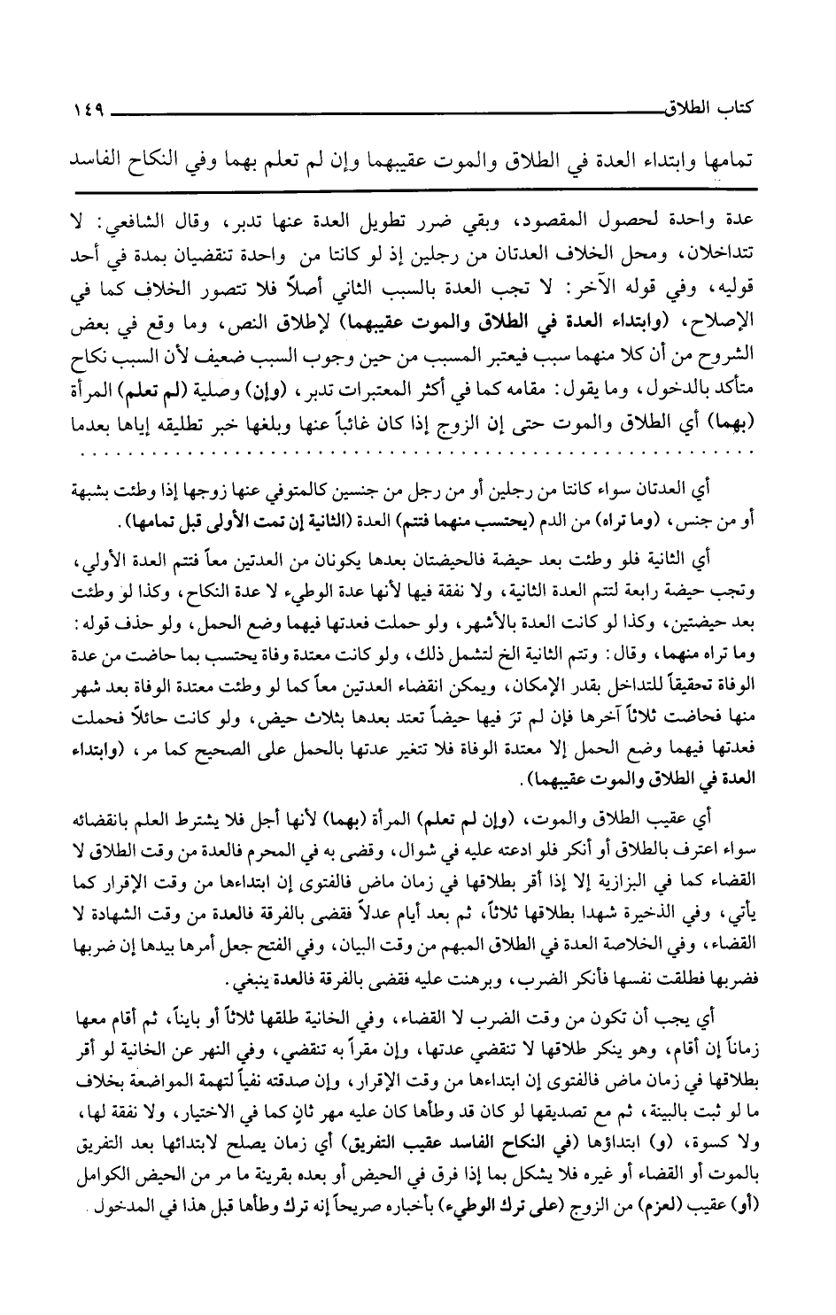 وابتداء العدة في الطلاق والموت عقيبهما لإطلاق النص وما وقع في بعض الشروح من أن كلا منهما سبب فيعتبر المسبب من حين وجوب السبب ضعيف لأن السبب نكاح متأكد بالدخول وما يقوم مقامه كما في أكثر المعتبرات تدبر
