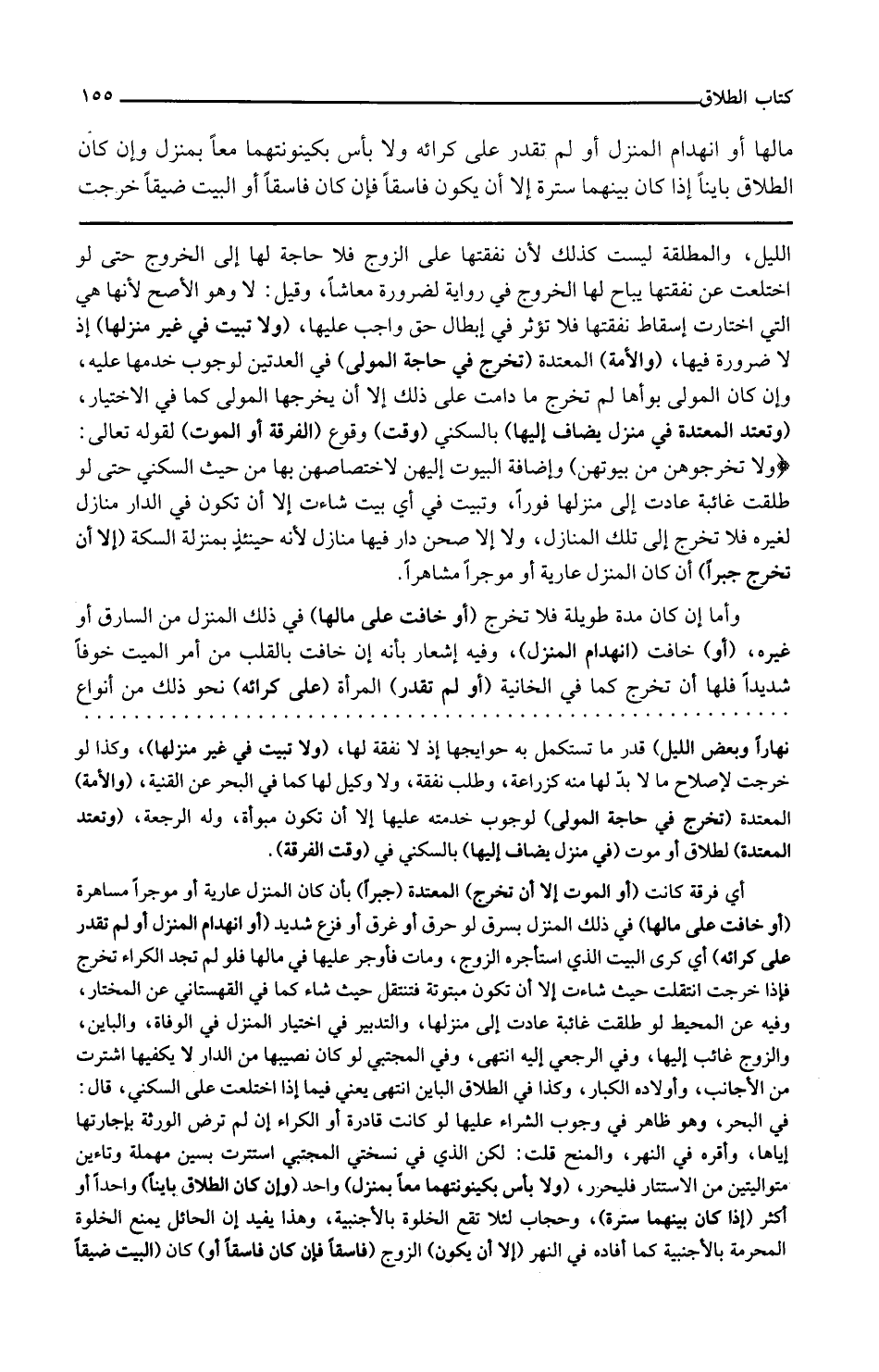 الليل والمطلقة ليست كذلك لأن نفقتها على الزوج فلا حاجة لها إلى الخروج حتى لو اختلعت عن نفقتها يباح لها الخروج في رواية لضرورة معاشها وقيل لا وهو الأصح لأنها هي التي اختارت إسقاط نفقتها فلا تؤثر في إبطال حق واجب عليها ولا تبيت في غير منزلها إذ لا ضرورة فيها والأمة المعتدة تخرج في حاجة المولى في العدتين لوجوب خدمتها عليه وإن كان المولى بوأها لم تخرج ما دامت على ذلك إلا أن يخرجها المولى كما في الاختيار وتعتد المعتدة في منزل يضاف إليها بالسكنى وقت وقوع الفرقة والموت لقوله تعالى لا تخرجوهن من بيوتهن وإضافة البيوت إليهن لاختصاصهن بها من حيث السكنى حتى لو طلقت غائبة عادت إلى منزلها فورا وتبيت في أي بيت شاءت إلا أن تكون في الدار منازل لغيره فلا تخرج إلى تلك المنازل ولا إلا صحن دار فيها منازل لأنه حينئذ بمنزل له السكة إلا أن تخرج جبرا بأن كان المنزل عارية أو مؤجرا مشاهرا وأما إن كان مدة طويلة فلا تخرج أو خافت على مالها في ذلك المنزل من السارق أو غيره أو خافت انهدام المنزل وفيه إشعار بأنه إن خافت بالقلب من أمر المبيت خوفا شديدا فلها أن تخرج كما في الخانية أو لم تقدر المرأة على كرائه نحو ذلك من أنواع