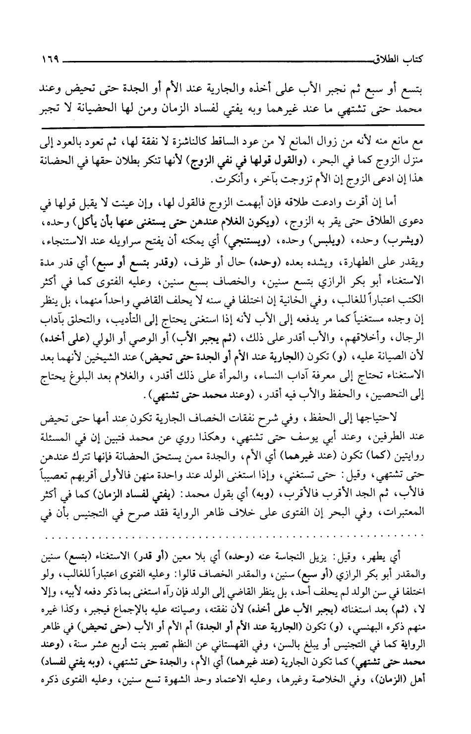 مع مانع منه لأنه من زوال المانع لا من عود الساقط كالناشزة لا نفقة لها ثم تعود بالعود إلى منزل الزوج كما في البحر والقول قولها في نفي الزوج لأنها تنكر بطلان حقها في الحضانة هذا إن ادعى الزوج أن الأم تزوجت بآخر وأنكرت أما إن أقرت وادعت طلاقه فإن أبهمت الزوج فالقول لها وإن عينت لا يقبل قولها في دعوى الطلاق حتى يقر به الزوج ويكون الغلام عندهن حتى يستغني عنها بأن يأكل وحده ويشرب وحده ويلبس وحده ويستنجي أي يمكنه أن يفتح سراويله عند الاستنجاء ويقدر على الطهارة ويشده بعده وحده حال أو ظرف وقدر بتسع أو سبع أي قدر مدة الاستغناء أبو بكر الرازي بتسع سنين والخصاف بسبع سنين وعليه الفتوى كما في أكثر الكتب اعتبارا للغالب