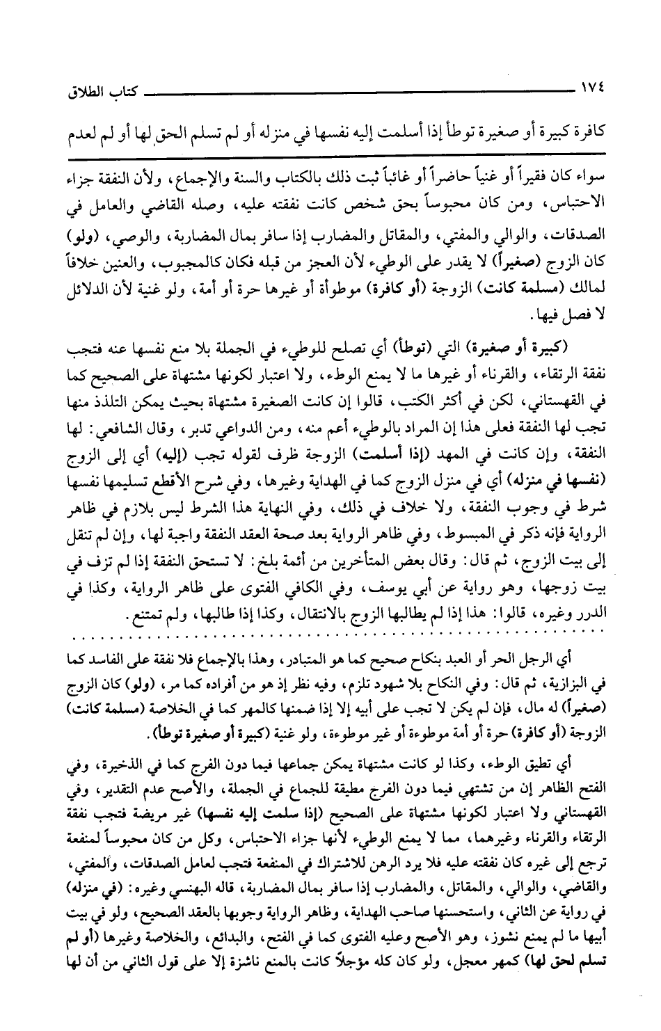 ولو كان الزوج صغيرا لا يقدر على الوطء لأن العجز من قبله فكان كالمجبوب والعنين خلافا لمالك مسلمة كانت الزوجة أو كافرة موطوءة أو غيرها حرة أو أمة ولو غنية لأن الدلائل لا فضل فيها كبيرة أو صغيرة التي توطأ أي تصلح للوطء في الجملة بلا منع نفسها عنه فتجب نفقة الرتقاء والقرناء أو غيرها مما لا يمنع الوطء ولا اعتبار لكونها مشتهاة على الصحيح كما في القهستاني لكن في أكثر الكتب قالوا إن كانت الصغيرة مشتهاة بحيث يمكن التلذذ منها تجب لها النفقة فعلى هذا أن المراد بالوطء أعم منه ومن الدواعي تدبر