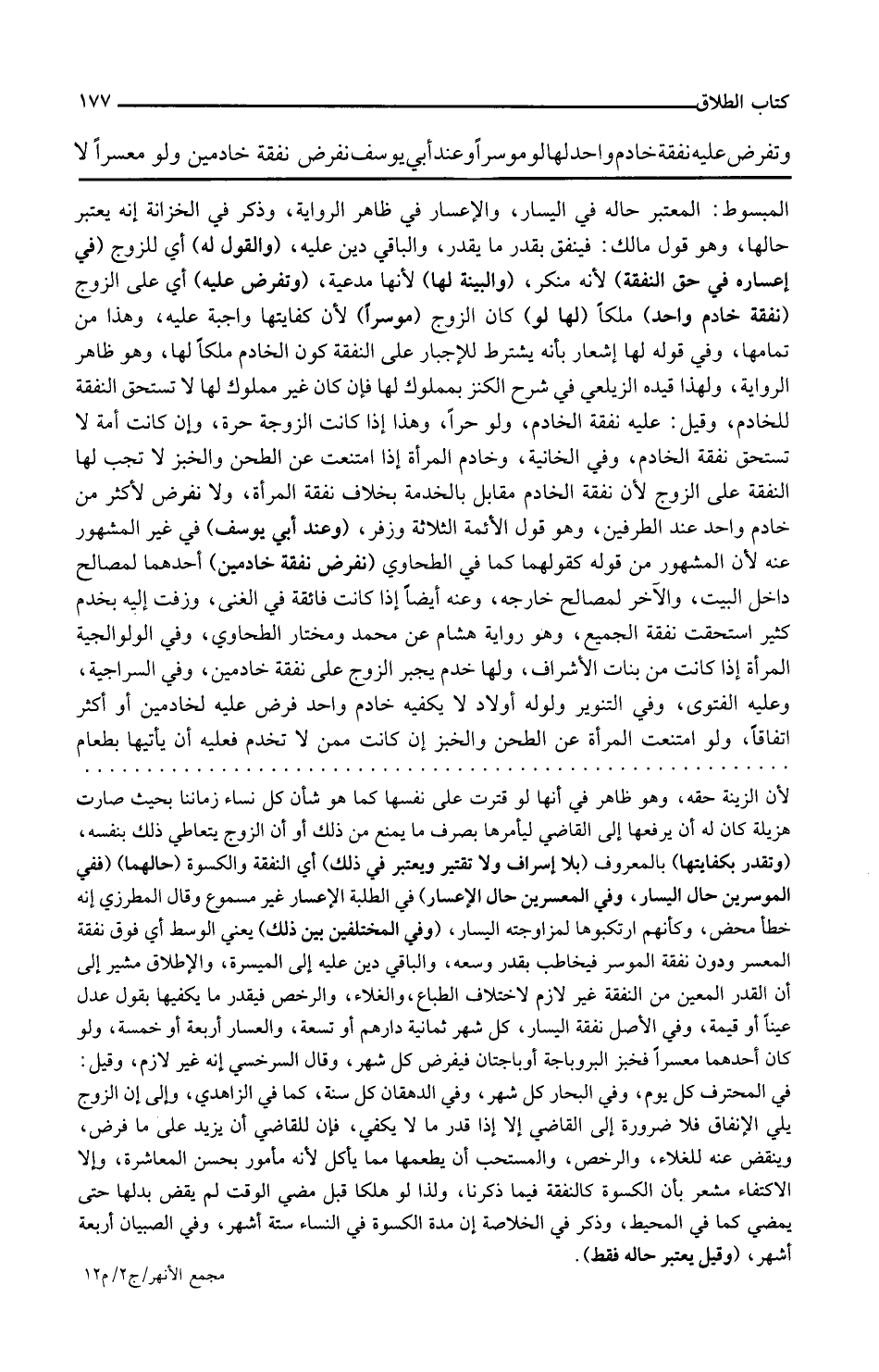 المبسوط المعتبر حاله في اليسار والإعسار في ظاهر الرواية وذكر في الخزانة أنه يعتبر حالها وهو قول مالك فينفق بقدر ما يقدر والباقي دين عليه والقول له أي للزوج في إعساره في حق النفقة لأنه منكر والبينة لها لأنها مدعية وتفرض عليه أي على الزوج نفقة خادم واحد ملكا لها لو كان الزوج موسرا لأن كفايتها واجبة عليه وهذا من تمامها وفي قوله لها إشعار بأنه يشترط للإجبار على النفقة كون الخادم ملكا لها وهو ظاهر الرواية ولهذا قيده الزيلعي في شرح الكنز بمملوك لها فإن كان غير مملوك لها لا تستحق النفقة للخادم وقيل عليه نفقة الخادم ولو حرا وهذا إذا كانت الزوجة حرة وإن كانت أمة لا تستحق نفقة الخادم