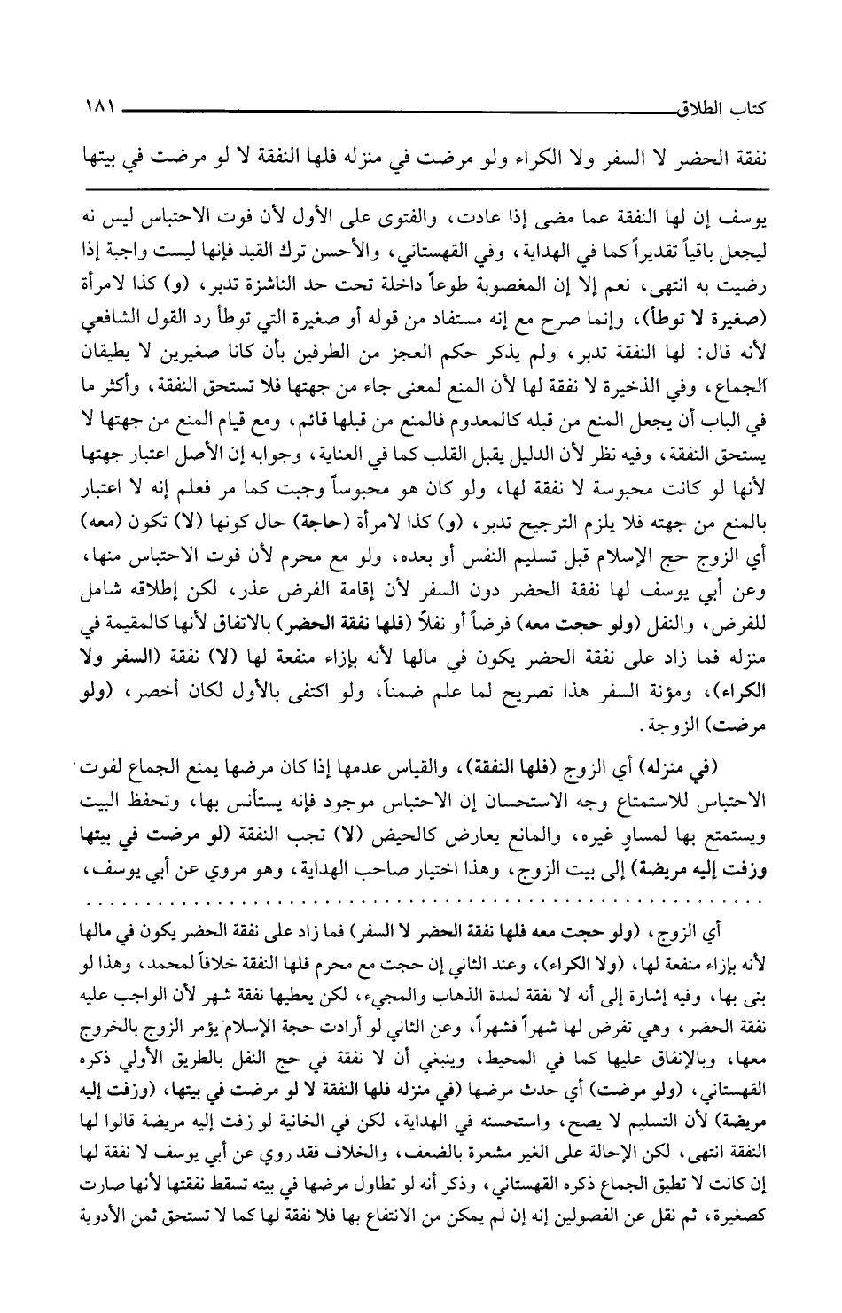 ولو مرضت الزوجة في منزله أي الزوج فلها النفقة والقياس عدمها إذا كان مرضها يمنع الجماع لفوت الاحتباس للاستمتاع وجه الاستحسان إن الاحتباس موجود فإنه يستأنس بها وتحفظ البيت ويستمتع بها لمساو غيره والمانع يعارض كالحيض لا تجب النفقة لو مرضت في بيتها وزفت إليه مريضة إلى بيت الزوج وهذا اختيار صاحب الهداية وهو مروي عن أبي يوسف