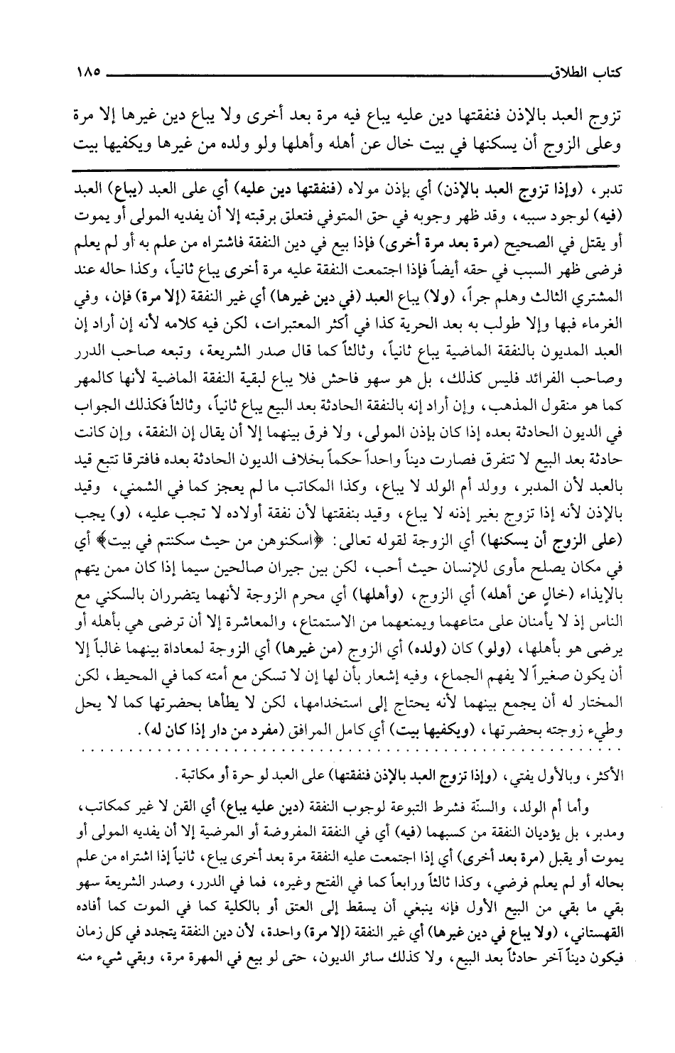 وإذا تزوج العبد بالإذن أي بإذن مولاه فنفقتها دين عليه أي على العبد يباع العبد فيه لوجود سببه وقد ظهر وجوبه في حق المتوفى فتعلق برقبته إلا أن يفديه المولى أو يموت أو يقتل في الصحيح مرة بعد مرة أخرى فإذا بيع في دين النفقة فاشتراه من علم به أو لم يعلم فرضي ظهر السبب في حقه أيضا فإذا اجتمعت النفقة عليه مرة أخرى يباع ثانيا وكذا حاله عند المشتري الثالث وهلم جرا ولا يباع العبد في دين غيرها أي غير النفقة إلا مرة فإن وفى الغرماء فبها وإلا طولب به بعد الحرية كذا في أكثر المعتبرات لكن فيه كلام لأنه إن أراد أن العبد المديون بالنفقة الماضية يباع ثانيا وثالثا كما قال صدر الشريعة وتبعه صاحب الدرر وصاحب الفرائد فليس كذلك بل هو سهو فاحش فلا يباع لبقية النفقة الماضية لأنها كالمهر كما هو منقول المذهب وإن أراد أنه بالنفقة الحادثة بعد البيع يباع ثانيا وثالثا فكذلك الجواب في الديون الحادثة بعده إذا كان بإذن المولى ولا فرق بينهما إلا أن يقال إن النفقة وإن كانت حادثة بعد البيع لا تتفرق فصارت دينا واحدا حكما بخلاف الديون الحادثة بعده فافترقا تتبع