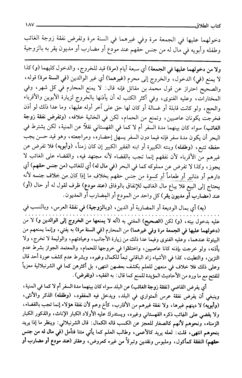 وتفرض نفقة زوجة الغائب سواء كان بينهما مدة السفر أم لا كما في القهستاني نقلا عن المنية لكن يشترط في البحر أن يكون مدة سفر فإنه فيما دون السفر يسهل إحضاره ومراجعته وهو قيد حسن يجب حفظه تتبع وطفله وبنته الكبيرة أو ابنه الفقير الكبير إن كان زمنا وأبويه فلا تفرض عن غيرهم من الأقرباء لأن نفقتهم إنما تجب بالقضاء لأنه مجتهد فيه والقضاء على الغائب لا يجوز وكذا لا تفرض عن مملوكه كما في البحر في مال له أي للغائب من جنس حقهم أي دراهم أو دنانير أو طعاما أو كسوة من جنس حقهم بخلاف ما إذا كان من خلاف جنسه لأنه يحتاج إلى البيع فلا يباع مال الغائب للإنفاق بالوفاق عند مودع ظرف لقول له أو حال أو عند مضارب أو مديون يقر كل واحد من المودع أو المضارب أو المديون به أي بمال الوديعة أو المضاربة أو الدين وبالزوجية في نفقة العرس وبالنسب في