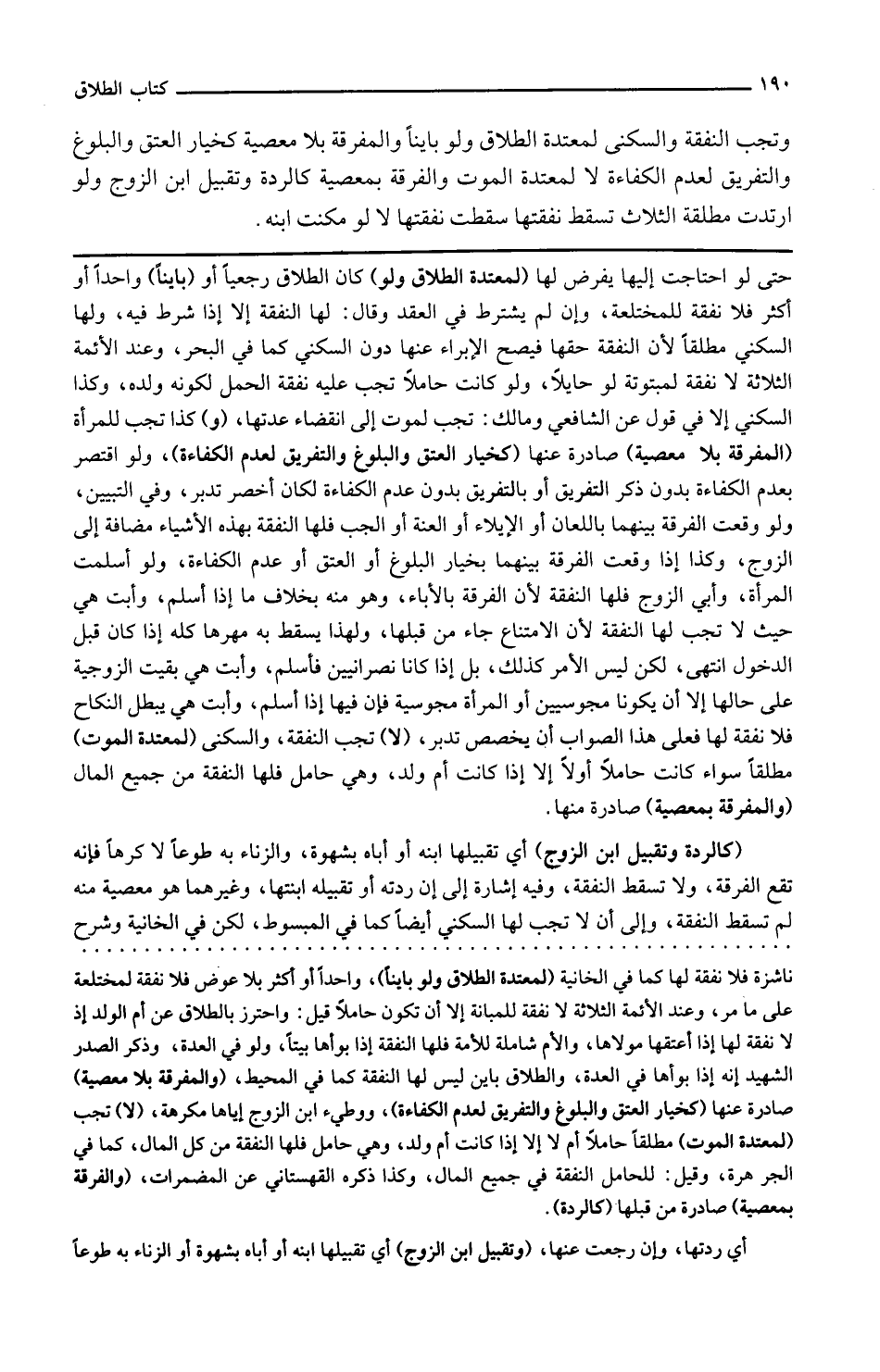 حتى لو احتاجت إليها يفرض لها لمعتدة الطلاق ولو كان الطلاق رجعيا أو بائنا واحدا أو أكثر فلا نفقة للمختلعة وإن لم يشترط في العقد وقال لها النفقة إلا إذا شرط فيه ولها السكنى مطلقا لأن النفقة حقها فيصح الإبراء عنها دون السكنى كما في البحر وعند الأئمة الثلاثة لا نفقة لمبتوتة لو حائلا ولو كانت حاملا تجب عليه نفقة الحمل لكونه ولده وكذا السكنى إلا في قول عن الشافعي ومالك تجب لموت إلى انقضاء عدتها و كذا تجب للمرأة المفرقة بلا معصية صادرة عنها كخيار العتق والبلوغ والتفريق لعدم الكفاءة ولو اقتصر بعدم الكفاءة بدون ذكر التفريق أو بالتفريق بدون عدم الكفاءة لكان أخصر تدبر