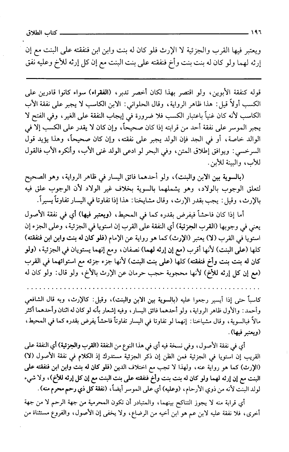 وفي البحر لو ادعى الولد غنى الأب وأنكره الأب فالقول للأب والبينة للابن بالسوية بين الابن والبنت ولو أحدهما فائق اليسار في ظاهر الرواية وهو الصحيح لتعلق الوجوب بالولاد وهو يشملهما بالسوية بخلاف غير الولاد لأن الوجوب علق فيه بالإرث وقيل يجب بقدر الإرث وقال مشايخنا هذا إذا تفاوتا في اليسار تفاوتا يسيرا أما إذا كان فاحشا فيفرض بقدره كما في المحيط ويعتبر فيها أي في نفقة الأصول يعني في وجوبها القرب والجزئية أي النفقة على القرب إن استويا في الجزئية وعلى الجزء إن استويا في القرب لا يعتبر الإرث كما هو رواية عن الإمام فلو كان له بنت وابن ابن فنفقته كلها على البنت لأنها أقرب مع أن إرثه لهما نصفان ومع أنهما يستويان في الجزئية