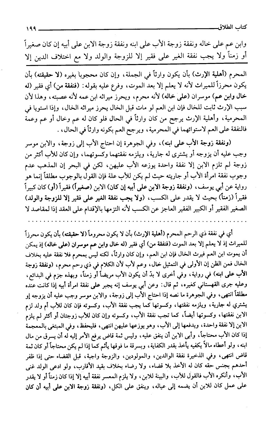 ونفقة زوجة الابن على أبيه إن كان الابن صغيرا فقيرا أو كان كبيرا فقيرا زمنا بحيث لا يقدر على الكسب ولا تجب نفقة الغير على فقير إلا للزوجة والولد الصغير الفقير أو الكبير الفقير العاجز عن الكسب لأنه التزمها بالإقدام على العقد إذ المقاصد لا
