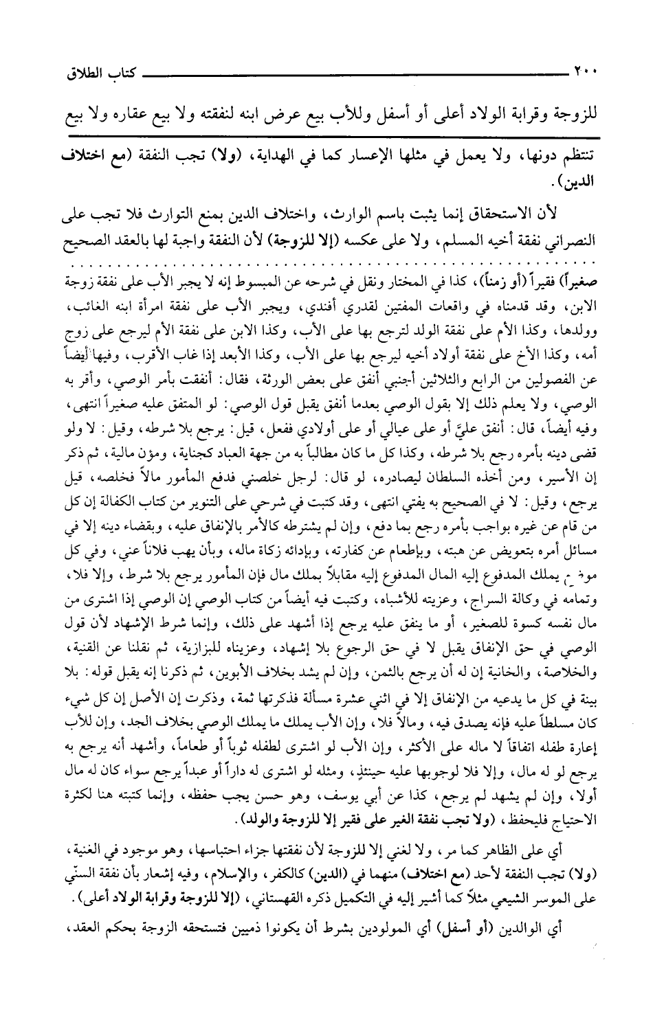 تنتظم دونها ولا يعمل في مثلها الإعسار كما في الهداية ولا تجب النفقة مع اختلاف الدين لأن الاستحقاق إنما يثبت باسم الوارث واختلاف الدين يمنع التوارث فلا تجب على النصراني نفقة أخيه المسلم ولا على عكسه إلا للزوجة لأن النفقة واجبة لها بالعقد الصحيح