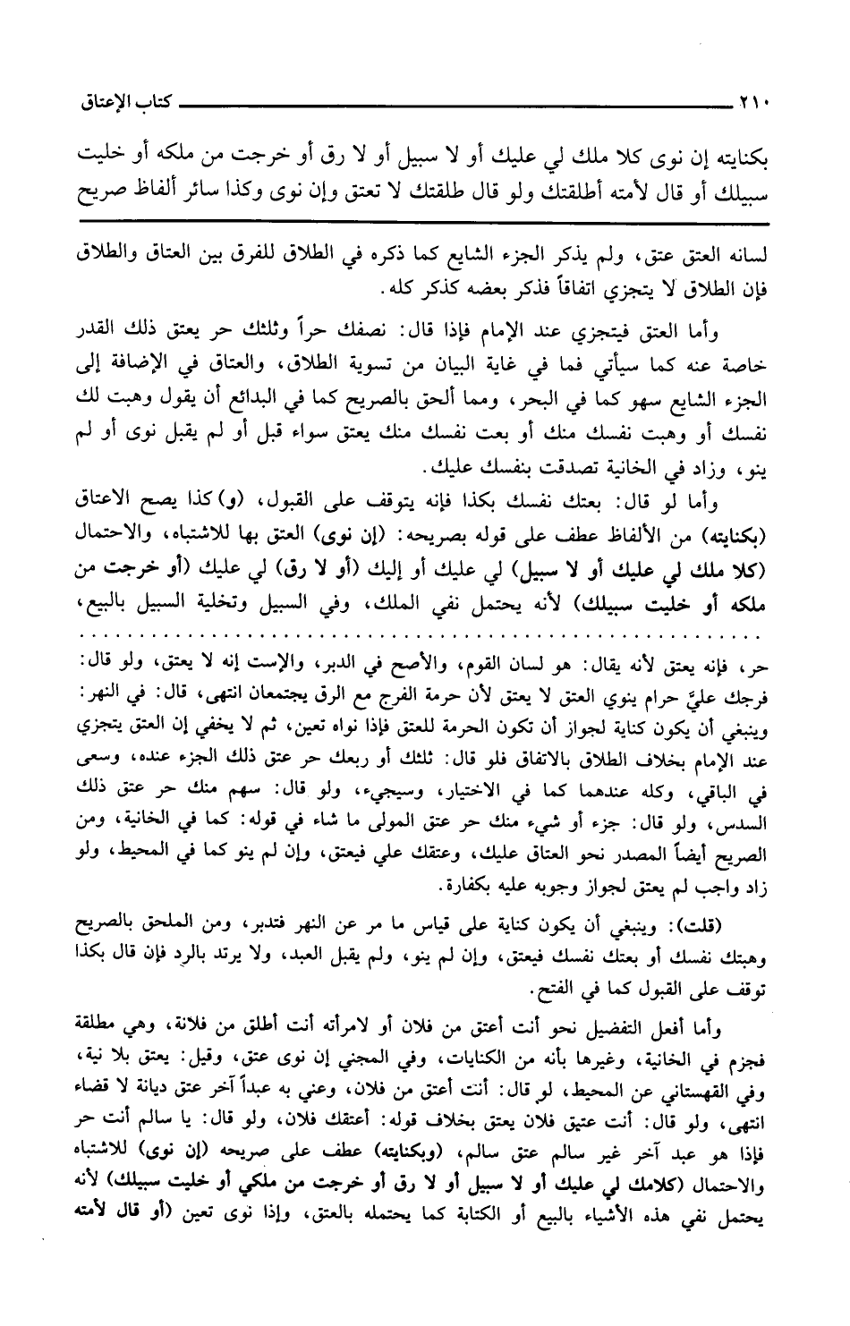 و كذا يصح الإعتاق بكنايته من الألفاظ عطف على قوله بصريحه إن نوى العتق بها للاشتباه والاحتمال كلا ملك لي عليك أو لا سبيل لي عليك أو إليك أو لا رق لي عليك أو خرجت من ملكي أو خليت سبيلك لأنه يحتمل نفي الملك ونفي السبيل وتخلية السبيل بالبيع